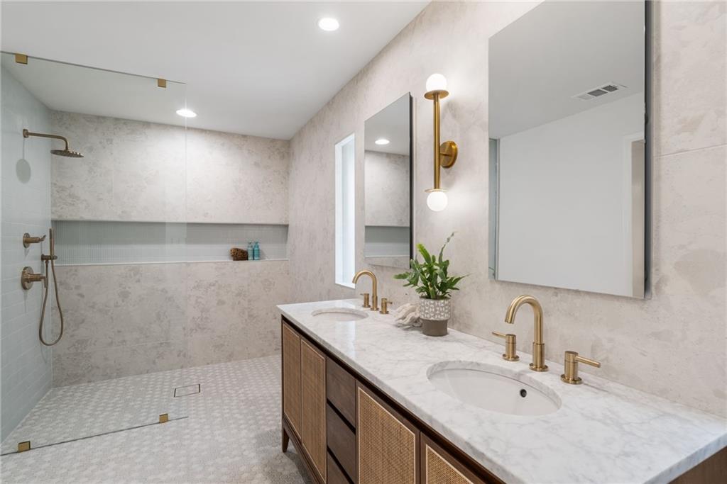 Tucked away on the west wing lies the owner’s suite, a sanctuary apart from the three spacious bedrooms. With not one, but two walk-in closets, and a bathroom that could make even Hera green with envy. The rosewood vanity, medicine cabinets set into the walls, and a curbless, walk-in shower with sea foam tiles and bronze finishes—it was as if crafted by the gods themselves.