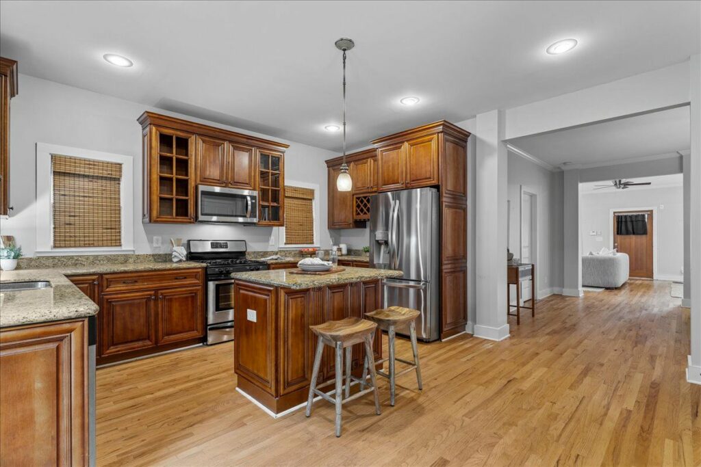 The living room opens wide with glowing hardwood floors, gas fireplace flickering, and natural light flooding in from walls of windows. The kitchen has granite for days, and an island made for group chats and charcuterie parties. You’ll enough cabinet space to actually stock more than three mugs and a bottle of sriracha. Gas cooking at your finger tips and double doors opening to evening summertime BBQ’s, just add string lights!
