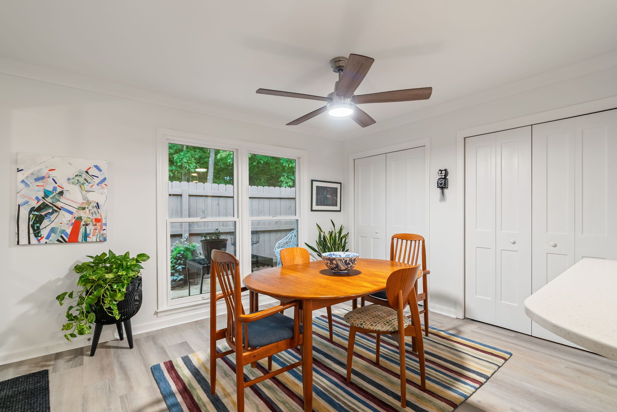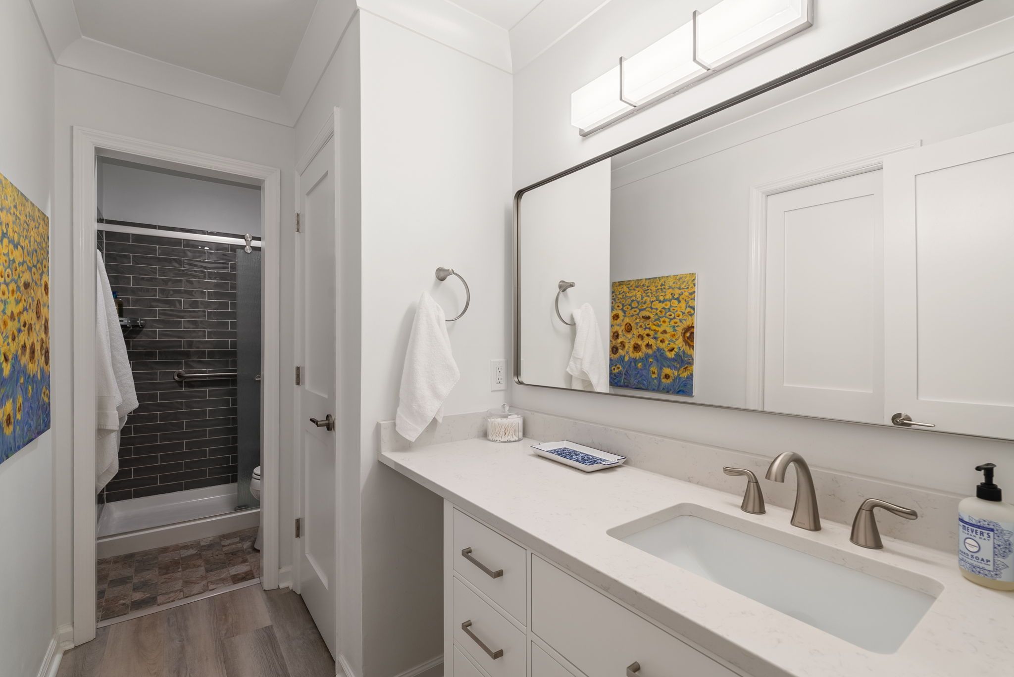 The kitchen has been fully renovated, with quartz countertops, sleek new appliances, and cabinets that close smoother than butter. It’s a kitchen made for Sunday omelets, Tuesday mimosas, and blueberry cobbler that demands a scoop of vanilla Häagen-Dazs. The owner’s suite is its own retreat. A walk-in shower, custom closets, and just enough room for both stillness and the beautiful mess of everyday life. The flooring throughout is high-quality, newer, and chosen with care, not for trend.