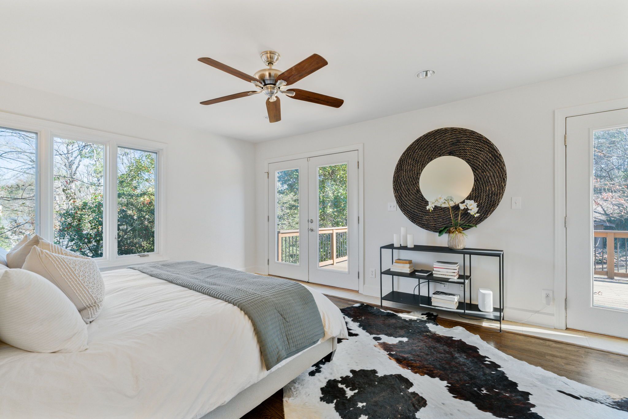 They didn’t say much. Just walked. From the living room to the upstairs owner’s suite. The primary bath was covered in marble with a soaking tub for lazy weekends and a frameless glass shower. It had probably won some sort of design award with its smart use of space and pocket door design. There were two sets of French doors that opened to a private deck overlooking the backyard. Heaven.