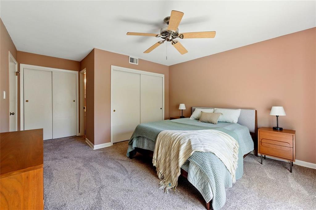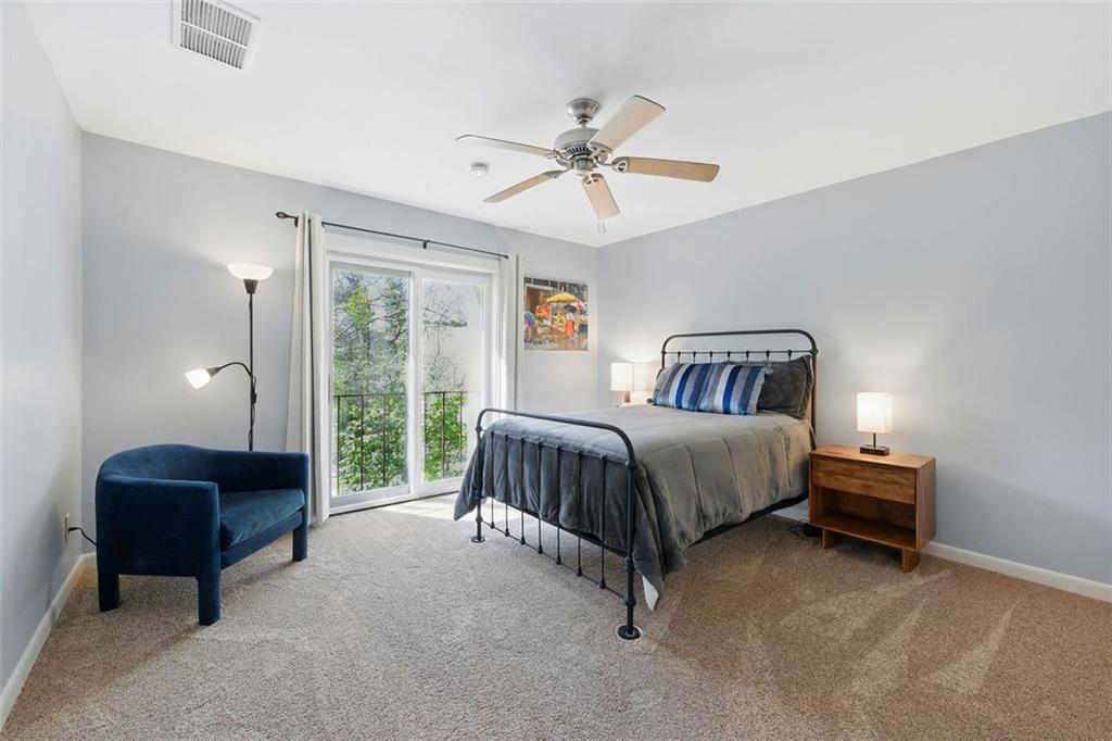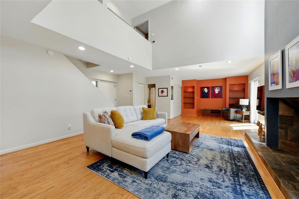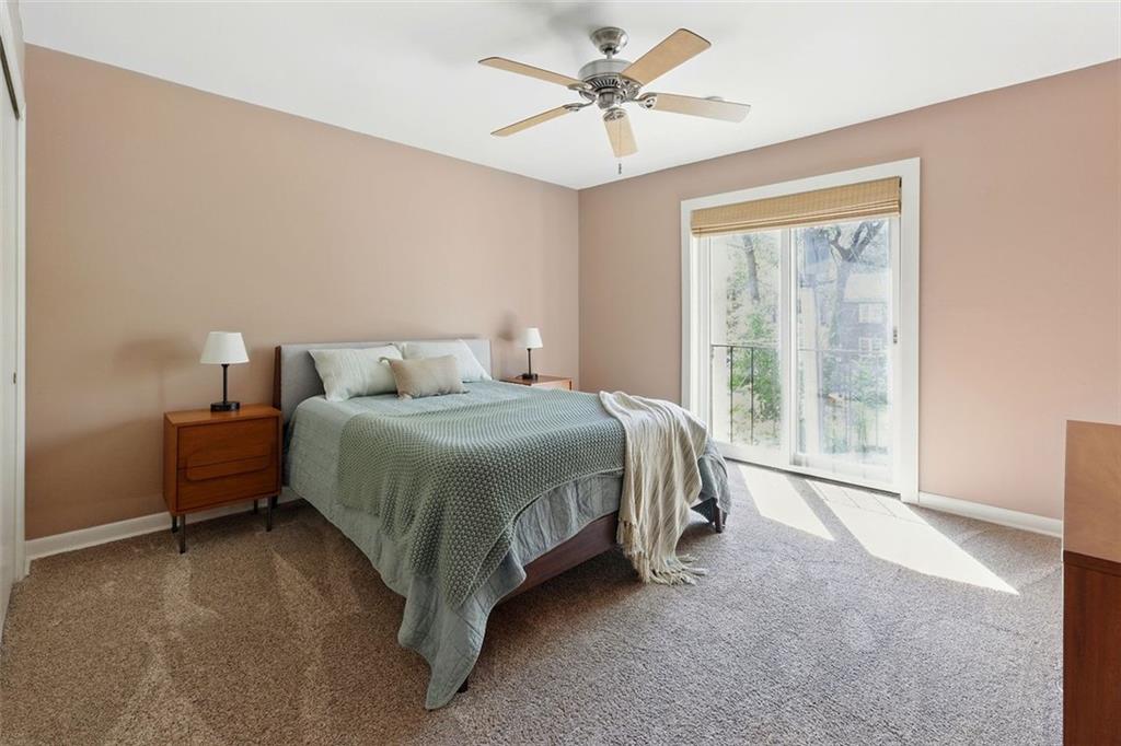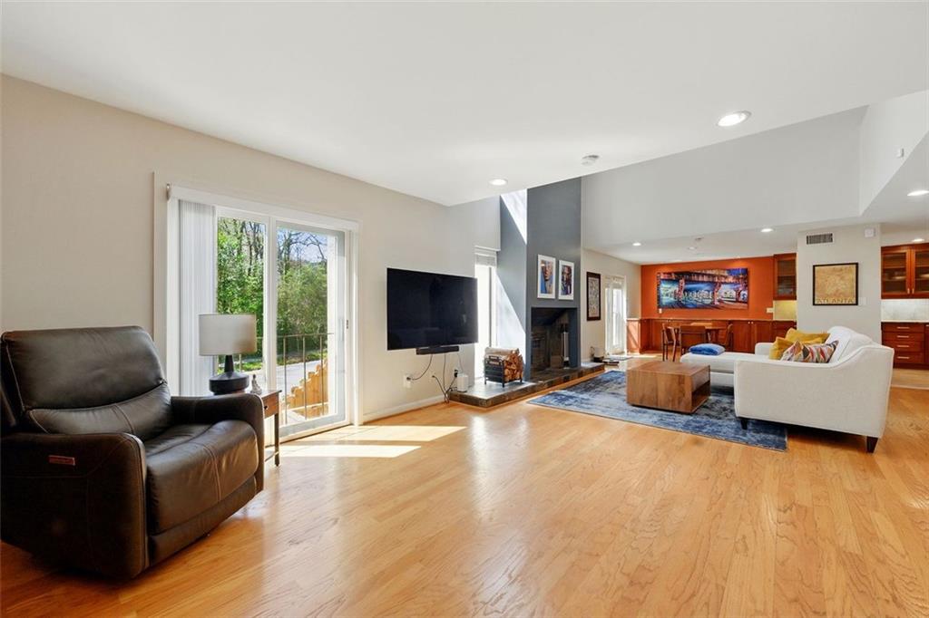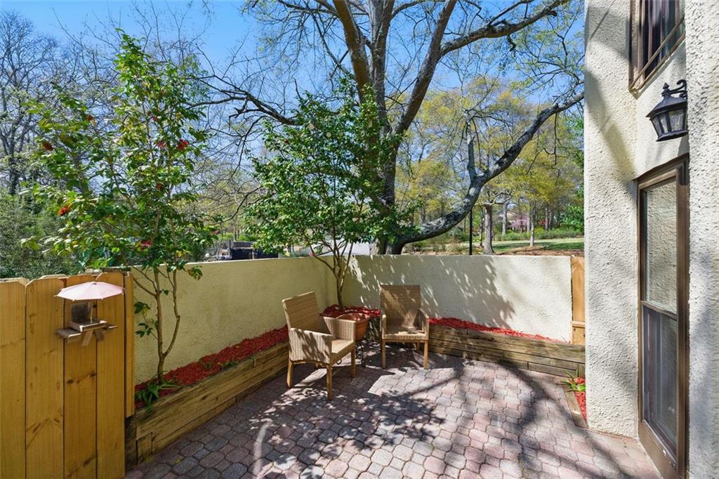 These midcentury modern condos are rarely on the market -- and almost never with new HVAC and a new roof! This 3 bedroom, 3 bath end unit sits in the quiet Chimneys community of Druid Hills and is adjacent to Paideia, Olmsted Linear Park and the Path . . . and also within walking distance to the Beltline, Virginia Highlands, and Little Five Points. The spacious and open main level floor plan features a double height living room, gleaming hardwood floors, and a wood-burning fireplace, all open to the dining room and kitchen. The kitchen features stone countertops and wood cabinets in earthy tones to complete the MCM aesthetic as well as stainless appliances including a dual-fuel Dacor range. Upstairs has two spacious bedrooms, two bathrooms, and laundry. The lower terrace level third bedroom has plenty of storage and natural light with walk-out sliding glass door and a private terraced patio. Outside, stairs lead to a patio area off of the main living level where you'll find a natural gas connection for grill. Low HOA and two dedicated parking spaces make this condo one you simply must see!