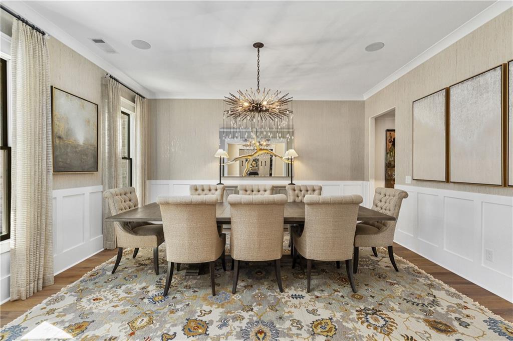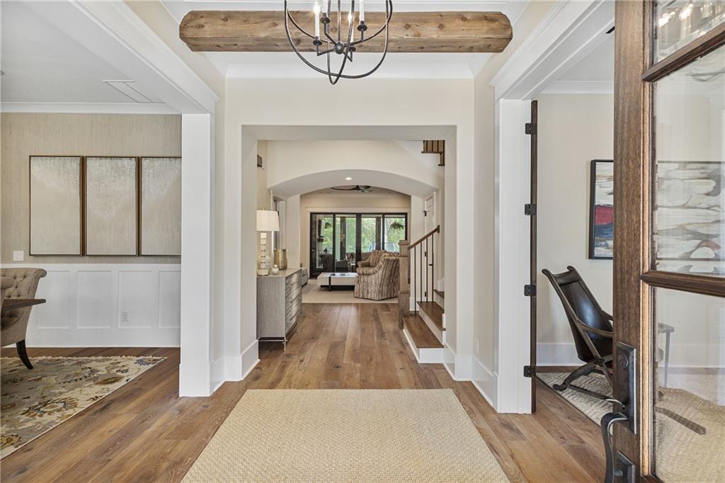 Ideally positioned less than a mile from the vibrant shops and dining of Downtown Alpharetta, this custom-built home seamlessly blends timeless elegance with today’s most desired conveniences. From the moment you arrive, this residence captivates with its brick herringbone front porch, accented by a stained tongue-and-groove ceiling - a warm invitation into the exceptional craftsmanship that defines the interior. Enter through the grand entryway and experience an inviting ambiance defined by soaring 10-foot ceilings, wide-plank hardwood floors, and meticulous architectural detailing. A sophisticated office with custom built-ins provides an inspiring workspace, while the exquisite dining room, illuminated by a statement Currey & Co chandelier, is perfect for intimate gatherings. The heart of the home unfolds in the expansive family room, where bespoke built-ins frame a gas fireplace, seamlessly flowing into a sunlit breakfast nook and a chef's dream kitchen. Designed for beauty and function, the kitchen features top-of-the-line Sub-Zero and Wolf appliances, custom shaker cabinetry, a striking wood hood, and an oversized island crowned with quartz countertops and a secondary prep sink. A hidden scullery offers additional storage and workspace, while an artistic wine bar featuring a specialty ice maker, wine refrigerator, and bottle storage enhances the home's entertaining capabilities. Blurring the lines between indoor and outdoor living, double sliding glass doors lead to an exceptional screened porch with a wood-burning fireplace and retractable screens with all-weather covers. Beyond, a picturesque backyard oasis awaits, featuring a stone patio with a built-in grill and fire pit - an idyllic setting for al fresco gatherings. Modern conveniences abound on the main level, including a thoughtfully designed mudroom drop zone, an oversized laundry room with extensive cabinetry and quartz countertops, and a flexible bonus nook, ideal as a reading retreat, Peloton space, or sunny sanctuary for pets. The primary suite on the main level is a true sanctuary, showcasing cathedral vaulted ceilings with exposed wood beams and a spa-inspired bath with dual quartz vanities, a spacious walk-in shower with a frameless glass enclosure, designer tile, and a custom walk-in closet with bespoke built-ins. Ascend to the upper level, where a fabulous loft-style bonus room with a beverage bar and refrigerator serves as a refined retreat. Three private bedroom suites, each adorned with luxurious quartz countertops, designer tile, and generous walk-in closets provide serene havens for family and guests alike. For added convenience, this home features a spacious three-car garage, including an oversized bay fully floored for extensive storage. A built-in motorized lift allows effortless transport of boxes and seasonal items to the upper level - all with the push of a button! A rare offering in one of Alpharetta’s most sought-after locations, this refined home now presents even greater value ~ a compelling opportunity to own extraordinary quality & design in the heart of it all!