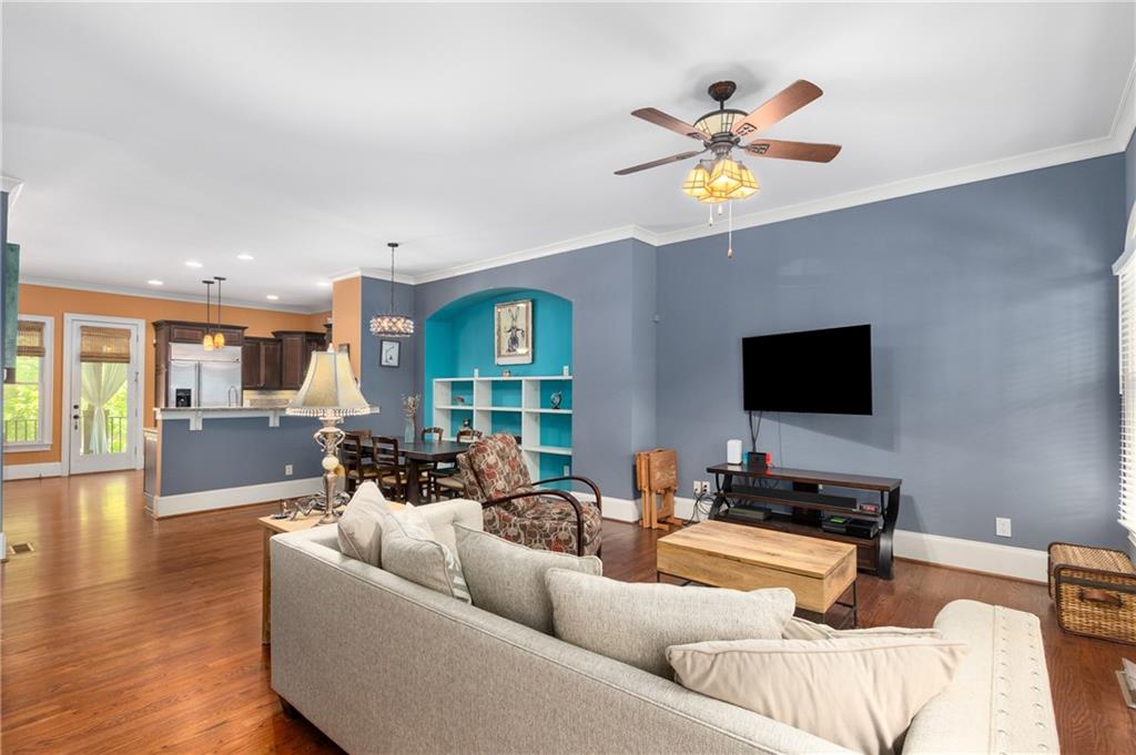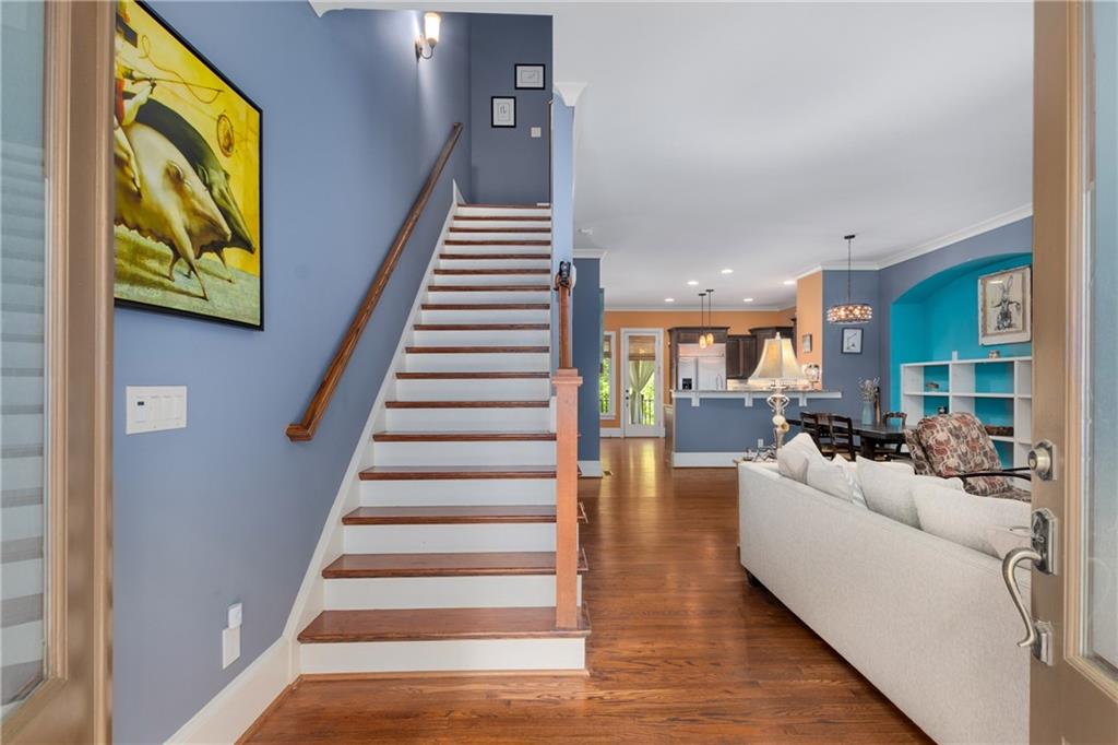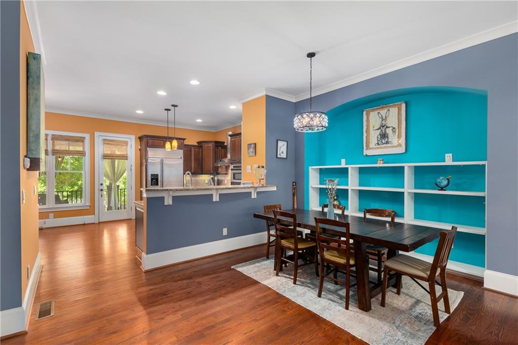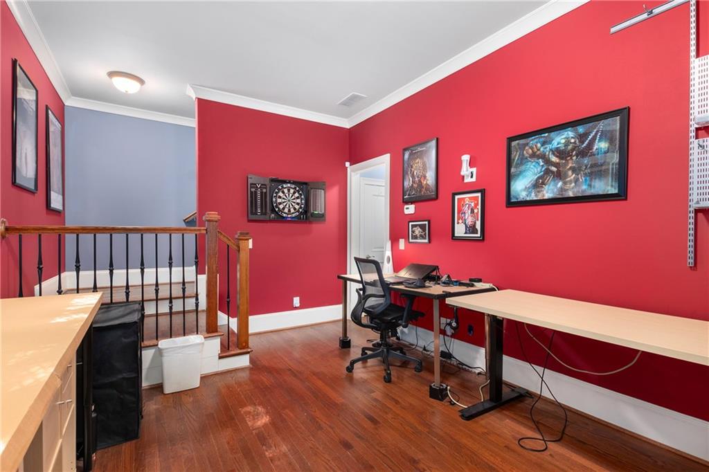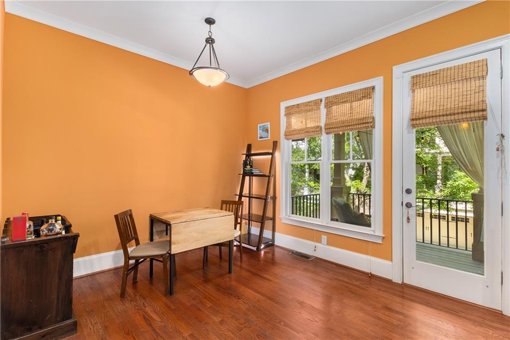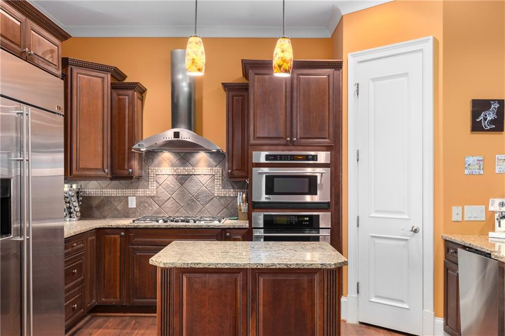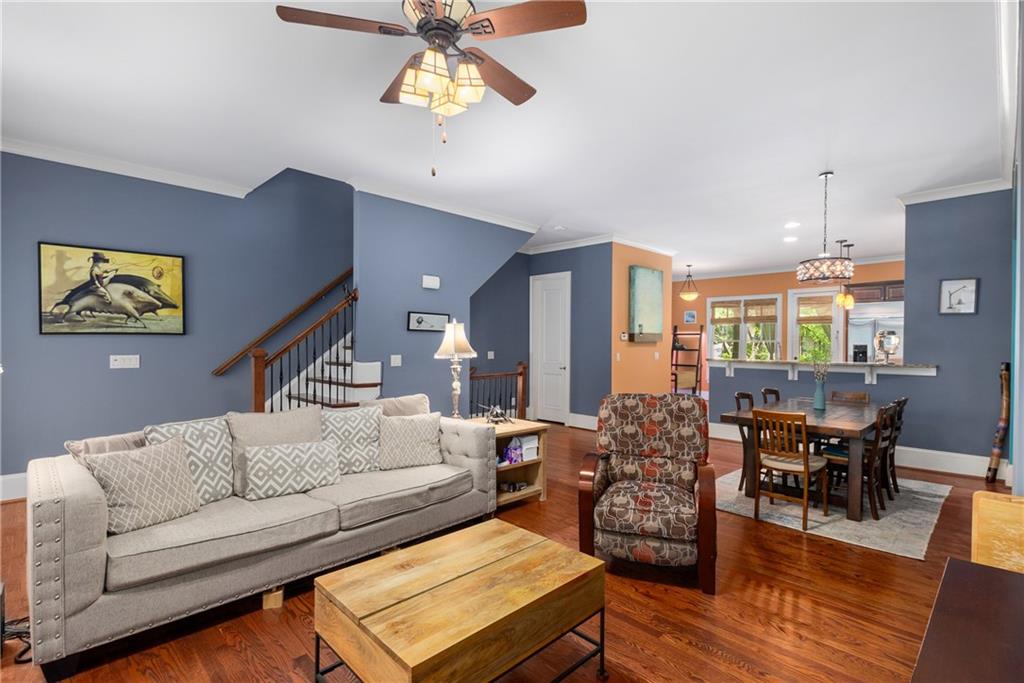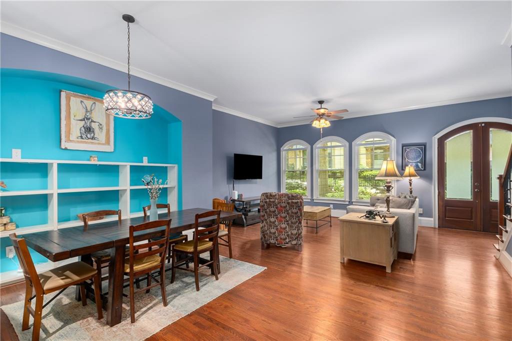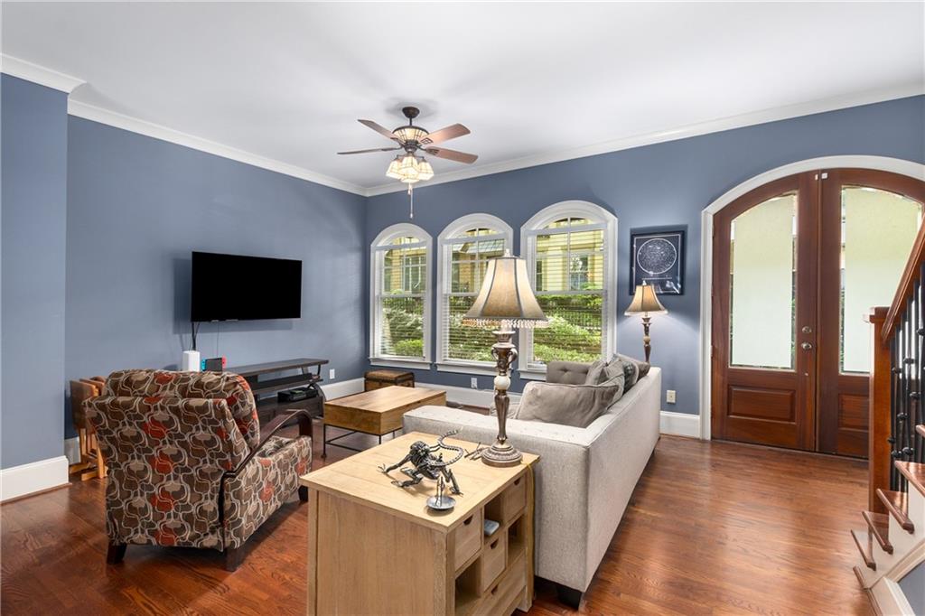 Nestled within the small idyllic enclave of European-style townhomes with meandering tree-lined sidewalks, this beautifully maintained home in the heart of Westside|Midtown|Atlantic Station is situated in THE most private location within the community, cushioned between Mecaslin and State Streets.the hidden gem of Atlantic Station! This sought-after open floor plan with three levels of hardwood flooring, 2 bedrooms, 2 full baths, 2 half baths PLUS DEN, was thoughtfully designed for ease of day-to-day living, as well as entertaining. The living room offers great natural sunlight and pretty views of the meandering sidewalk and lush tree canopy outside. Casual, as well as elegant dining can be enjoyed in the dining area with space for all to sit comfortably and is elevated by custom built-in shelving to display precious-to-you artwork, antique serving dishes, or to use a library for a special book collection. Whether preparing a lavish meal for a holiday get-together or a quiet weekday dinner, the gourmet kitchen with direct access leading to the covered private back deck, will delight every chef enthusiast! Features include an island with storage, breakfast bar, pantry, stainless appliances, 5-burner gas cooktop, and a cozy eating area, an ideal spot for your morning coffee or tea. There is a half bath located on this main living level. The upper level offers two primary suites, each with private full bath, double vanities and walk-in closet. The laundry is conveniently located on this level, along with a hall linen closet. Turn the first level den with half bath and spacious closet, into your at-home office, game room, guest suite or anything that fits your lifestyle. A NEW ROOF with transferrable warranty provides peace of mind for years to come and plenty of parking is available in the 2-car garage, as well as space for an additional 2 cars in the driveway. Just steps from office space, retail shopping, grocery, restaurants, arts, entertainment, GA Tech and more, yet surprisingly tucked away from the hubbub of city life. Hop on the free shuttle from Atlantic Station to MARTA Arts Center Station and explore all Atlanta has to offer OR stay close to home and take advantage of all the year-round festivities in Atlantic Station!