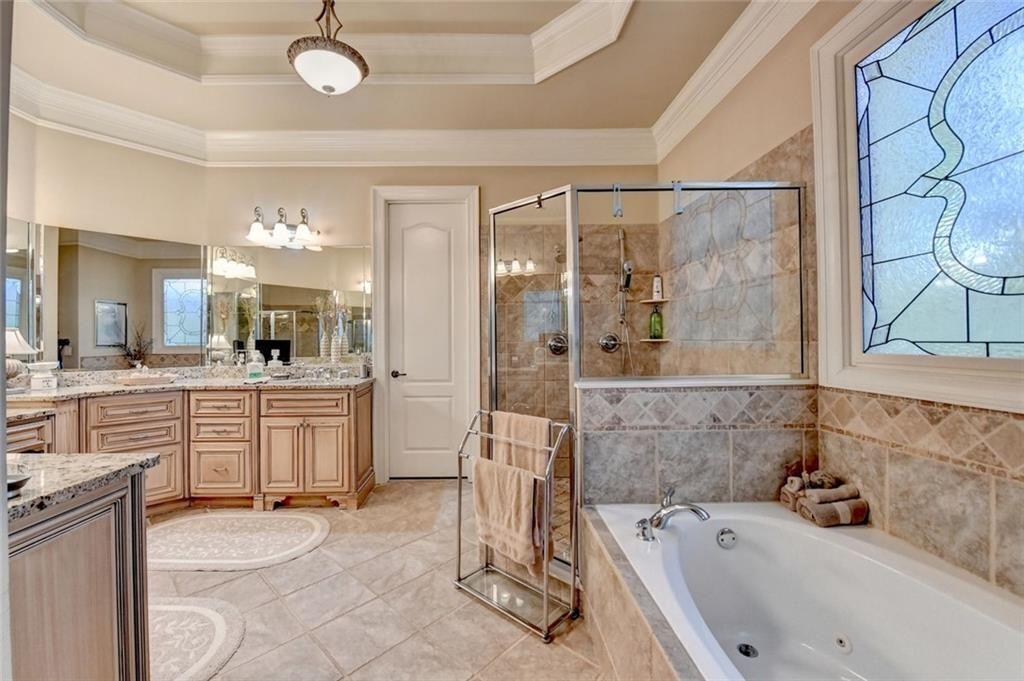 Discover the ultimate in upscale living in one of the area's most prestigious communities, centered around a breathtaking 150-acre Scottish-designed golf course with 19 shimmering lakes. Perfect for golf lovers and nature enthusiasts, this exceptional home sits on one of the best lots in the neighborhood, offering panoramic views of the fairways and water, along with your own private PebbleTec saltwater pool and spa. From the moment you arrive, the curb appeal and meticulously landscaped grounds set the tone for what lies inside. Enjoy the fresh feel of newly refinished hardwood floors and beautifully updated kitchen cabinets that bring a modern, inviting look to the heart of the home. Step into a grand two-story family room anchored by a dramatic stone fireplace—ideal for both quiet nights in and elegant entertaining. The oversized gourmet kitchen is a chef’s dream, featuring premium finishes and a sunny breakfast room that welcomes the morning light. The spacious owner’s suite is conveniently located on the main level, offering direct access to your private pool and hot tub—your own personal retreat. Upstairs, you'll find three additional bedrooms, including one with an en-suite bath and two sharing a Jack-and-Jill, all designed for comfort and privacy. Seamlessly transition from indoor to outdoor living with a walk-out from the kitchen to the pool area—perfect for summer gatherings and sunset cocktails. As the sun dips below the horizon, enjoy the tranquil beauty of the surroundings from your back porch. An unfinished terrace level provides endless potential to create additional living space, a custom entertainment zone, or a home gym—tailor it to your vision. This isn’t just a home—it’s a lifestyle. Don’t miss your chance to own this extraordinary property where luxury, comfort, and community come together in perfect harmony.