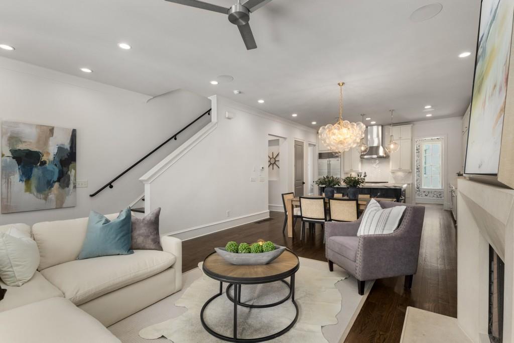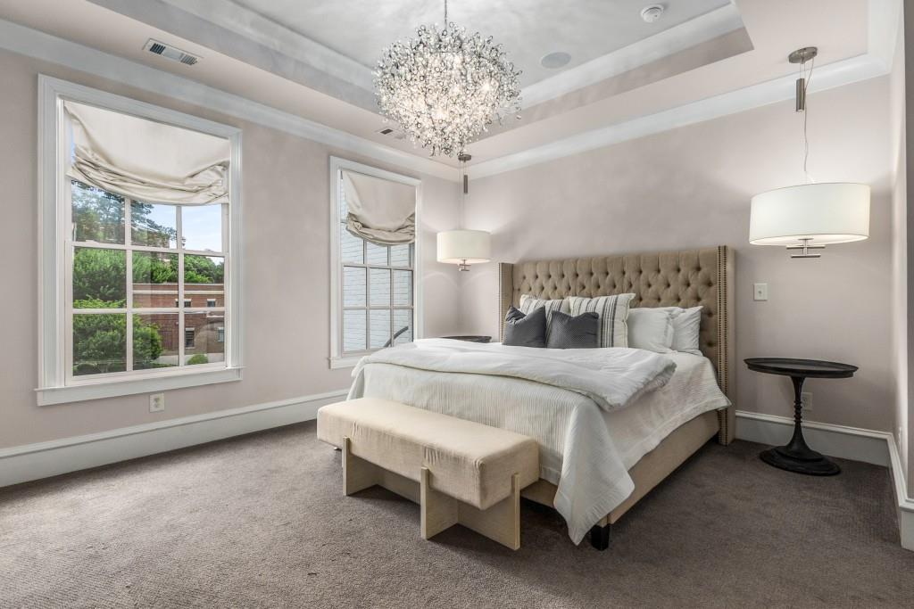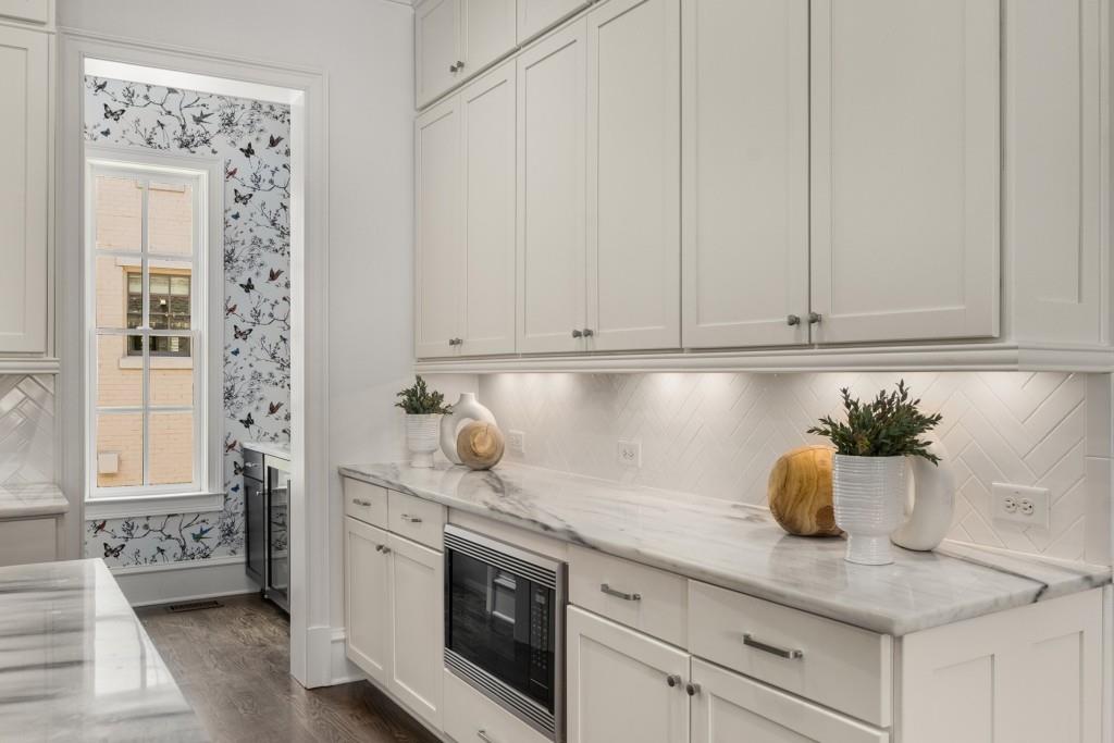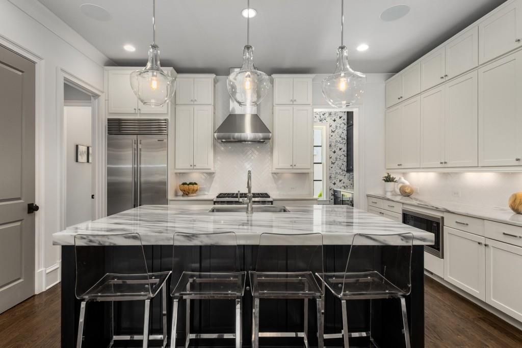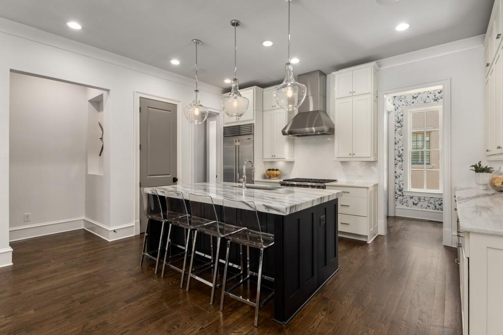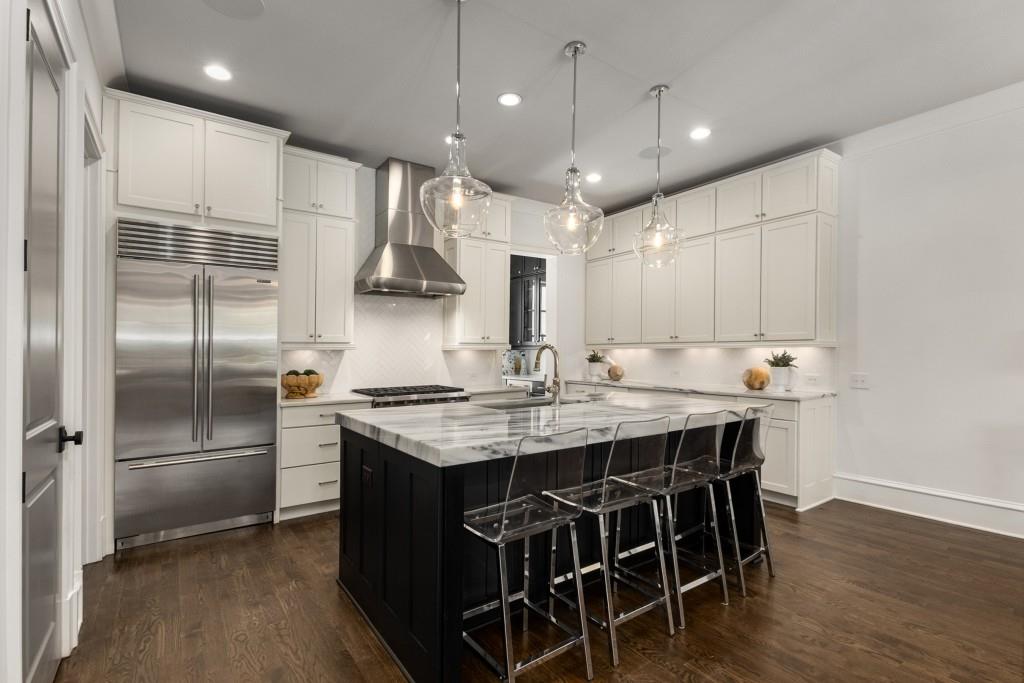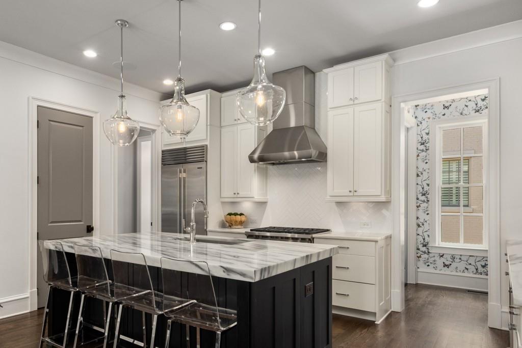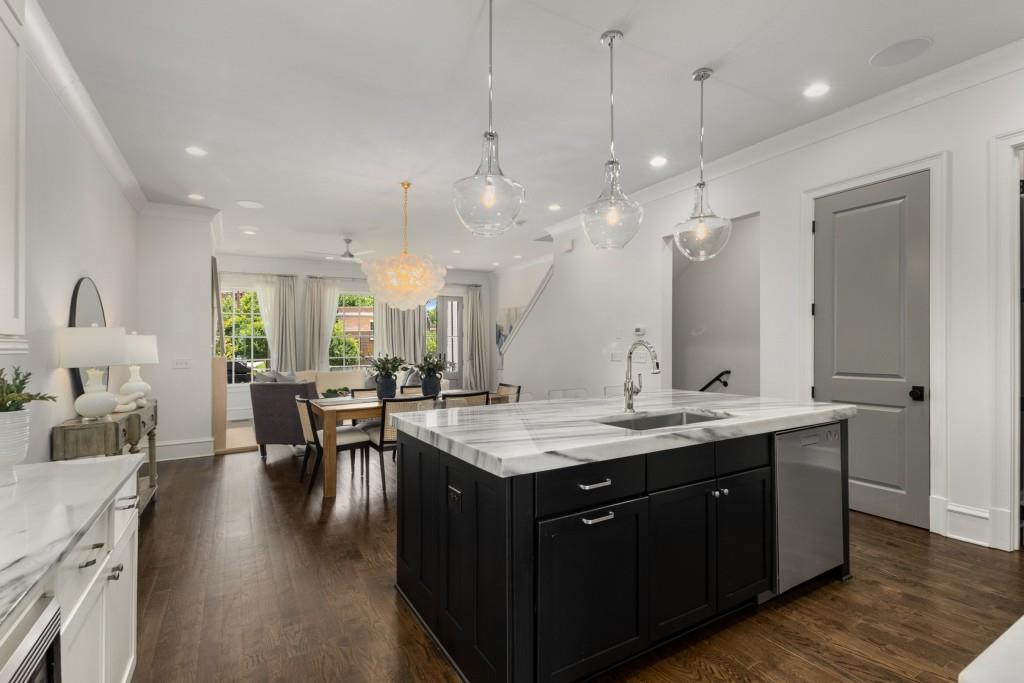 Located in sought-after St. Andrews, this stunning Tuxedo floor plan offers three levels of luxury living. The main level offers an open floor plan with hardwood floors and a beautiful kitchen detailed by double-stacked cabinetry, thick marble slab countertops, a Wolf gas range, a Sub-Zero refrigerator, a large island with seating and an adjacent beverage center with a wine refrigerator and glassware storage. The kitchen flows seamlessly into the dining area and fireside living room, creating an ideal layout for everyday living and entertaining. Double French doors open to the large balcony off the living room and provide the perfect space for grilling or winding down at the end of the day. Upstairs, the tranquil primary suite offers a tray ceiling lined with oversized molding, a stunning chandelier that castes soft light across the bedroom and a marble-detailed en suite bathroom with a double vanity, a freestanding bathtub and a zero-entry seamless glass shower. Dual walk-in closets off the bathroom offer extensive built-ins for even the most extensive wardrobe. A second bedroom with an en suite bathroom and classic black and white design choices complete the upper level. The lower level includes hardwood floors, a third bedroom with plantation shutters, an en suite bathroom and access to the drive-under two-car garage. St. Andrews' incredible location means you can leave the car at home and head out to some of Atlanta's best restaurants, world-class shopping, Whole Foods, St. Regis, the Buckhead Theater and more! With the Buckhead Village District right down the street, there is always something to do! Welcome home!
