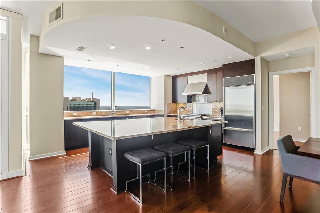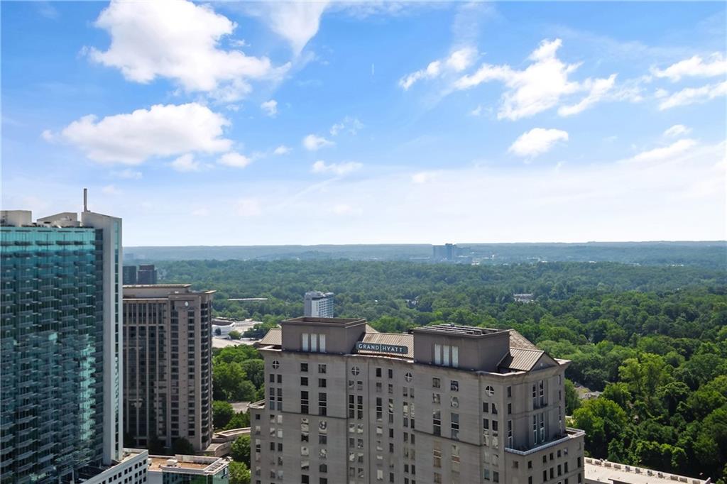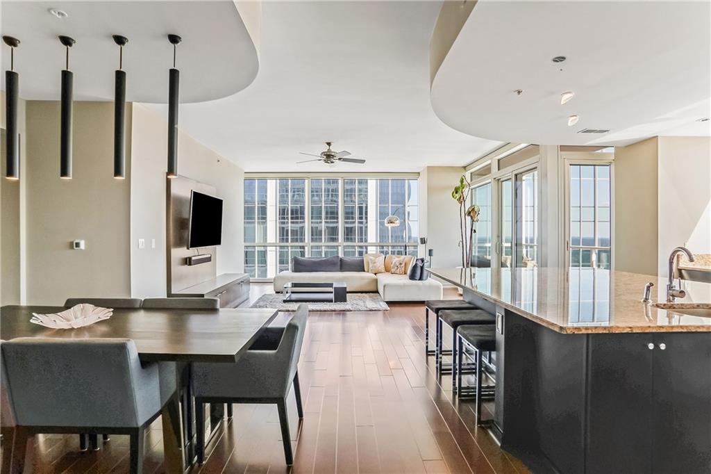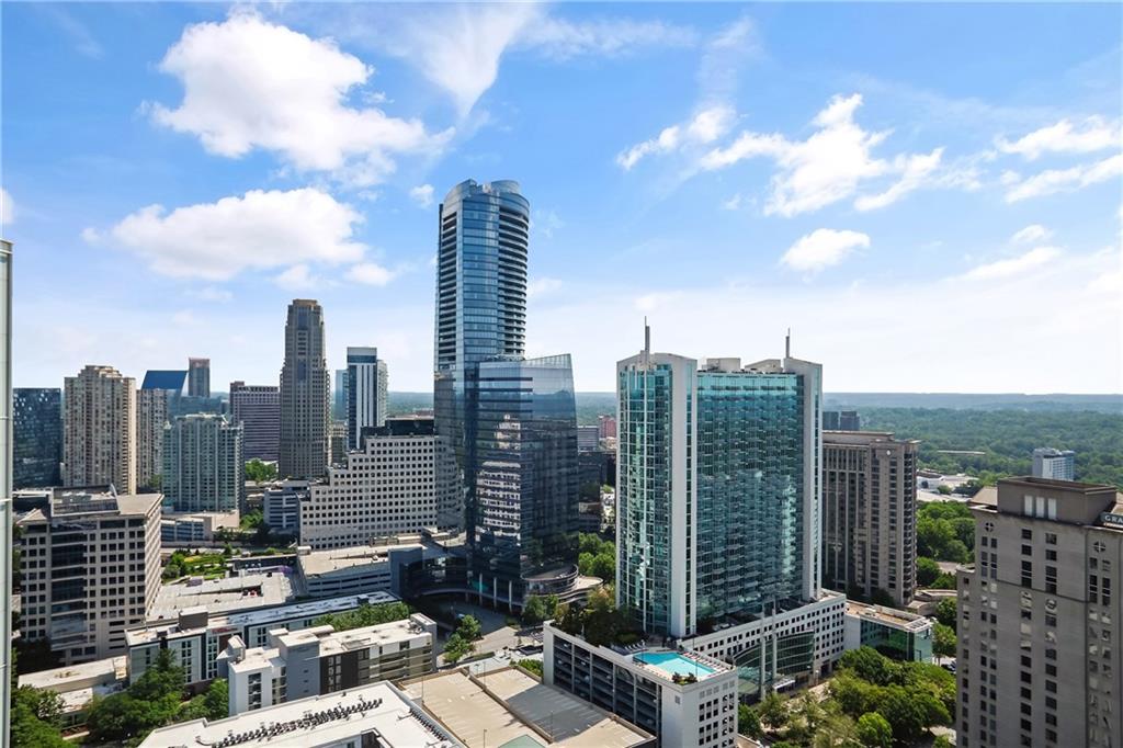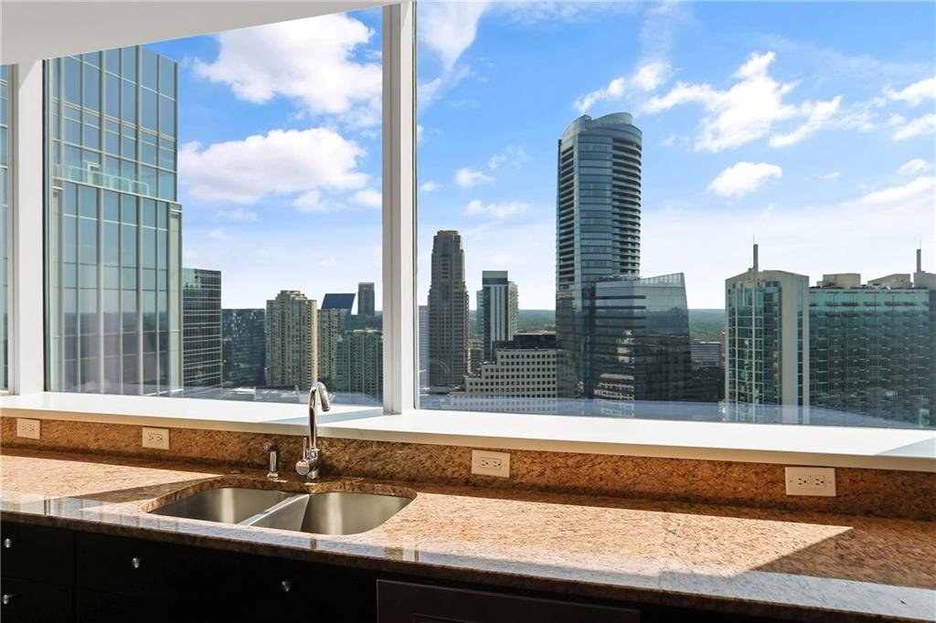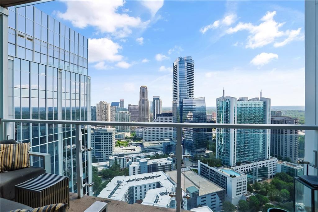 Perched high above Buckhead with sweeping views stretching to Stone Mountain, this rare 3-bedroom, 3-bathroom corner residence with stunning views is one of only three with this coveted floor plan in the Terminus building — and is rarely available! Light pours in through floor-to-ceiling windows that wrap around the main living space as well as the chef’s kitchen. Enjoy an oversized island with seating, granite countertops, a Wolf gas range, a Sub-Zero refrigerator, and a Bosch dishwasher. The kitchen flows seamlessly into the dining area, where a custom glass-front bar with a wine storage tower and a beverage fridge anchors the space, perfect for entertaining. The hardwood floors continue from the kitchen and dining area into the living room, which features a custom-built entertainment wall and access to the private balcony overlooking the Buckhead skyline, treetops and sprawling view. The primary suite is a true retreat with expansive views from floor-to-ceiling windows, custom built-ins, motorized shades and a large walk-in closet with abundant storage and customization options. The en suite spa-inspired bathroom features a dual vanity, a built-in separate vanity with storage, a water closet and a European-style wet room with a large shower and a bathtub behind a seamless glass wall. Two additional bedrooms with walk-in closets provide flexibility for guests or a home office — one with an en suite bathroom, the other with a full hall bathroom. A spacious laundry room adds convenience and additional storage space. Terminus impresses with resort-style amenities including 24-hour concierge, valet, pool, fitness center, guest suites, pet walk, and more — all in the heart of Buckhead, just moments from fine dining, luxury retail, and MARTA.