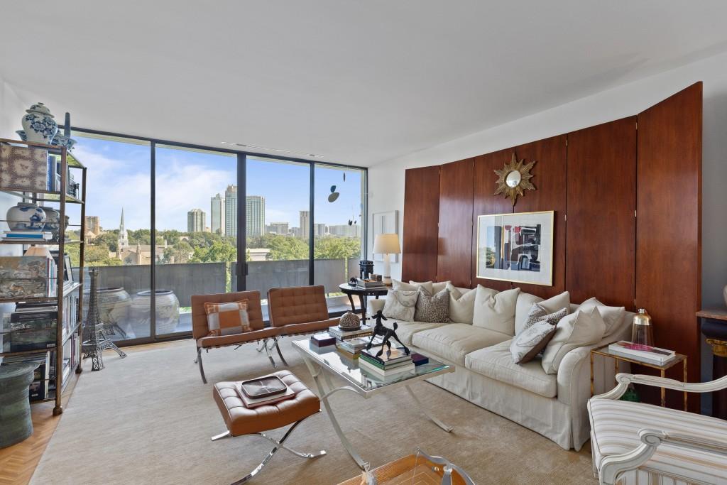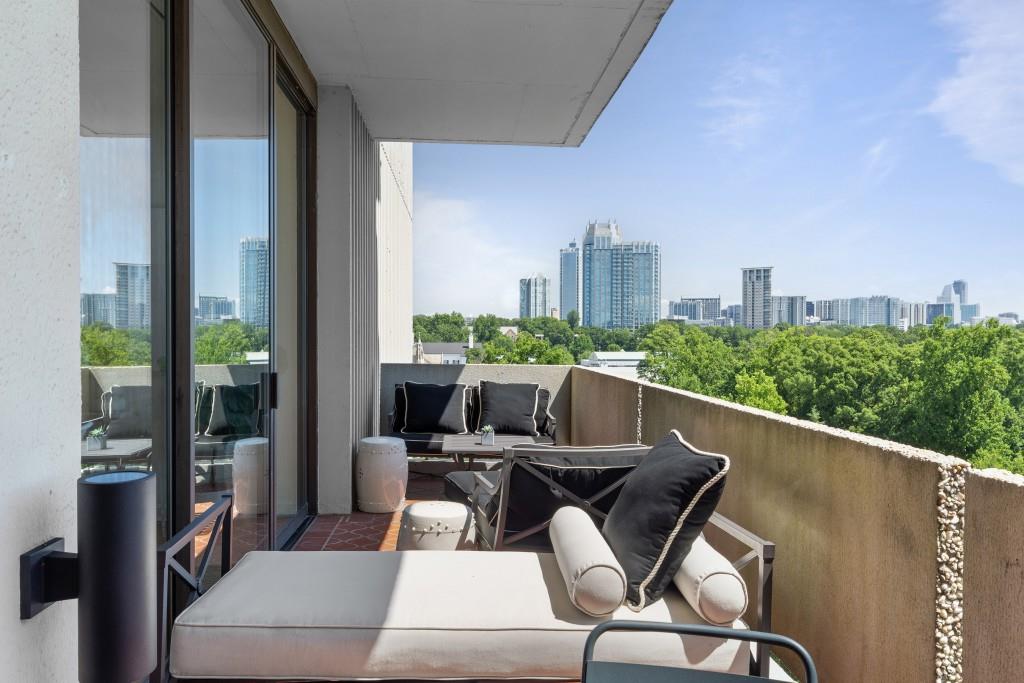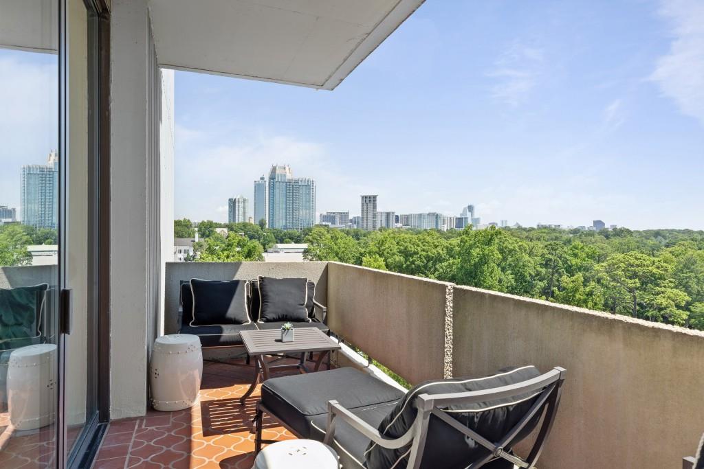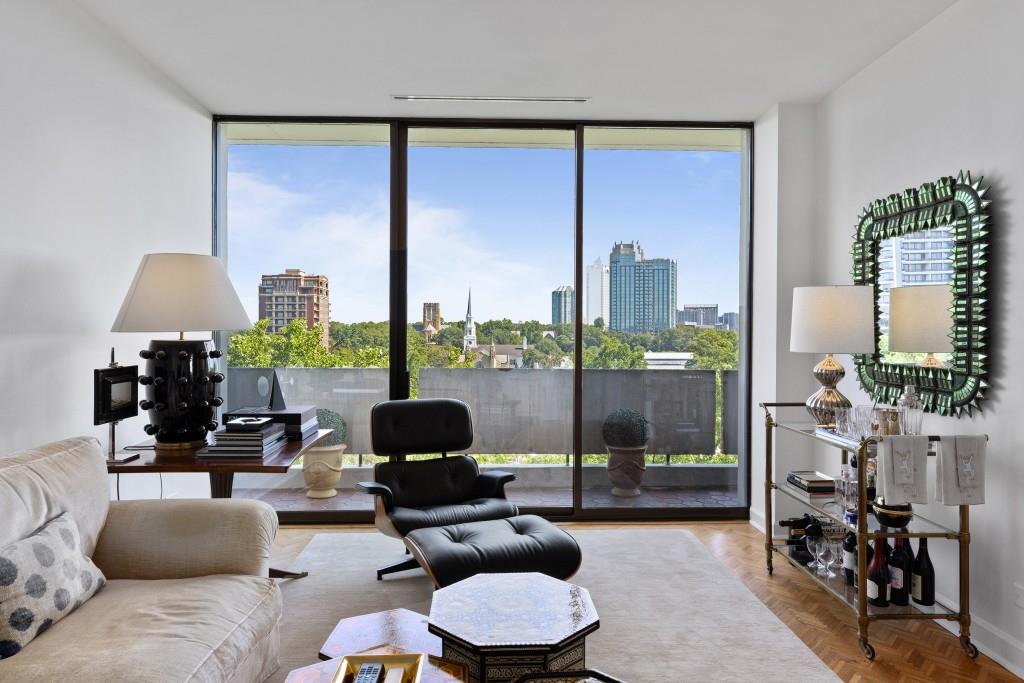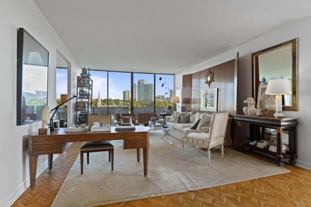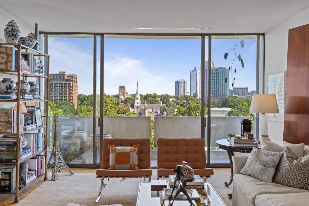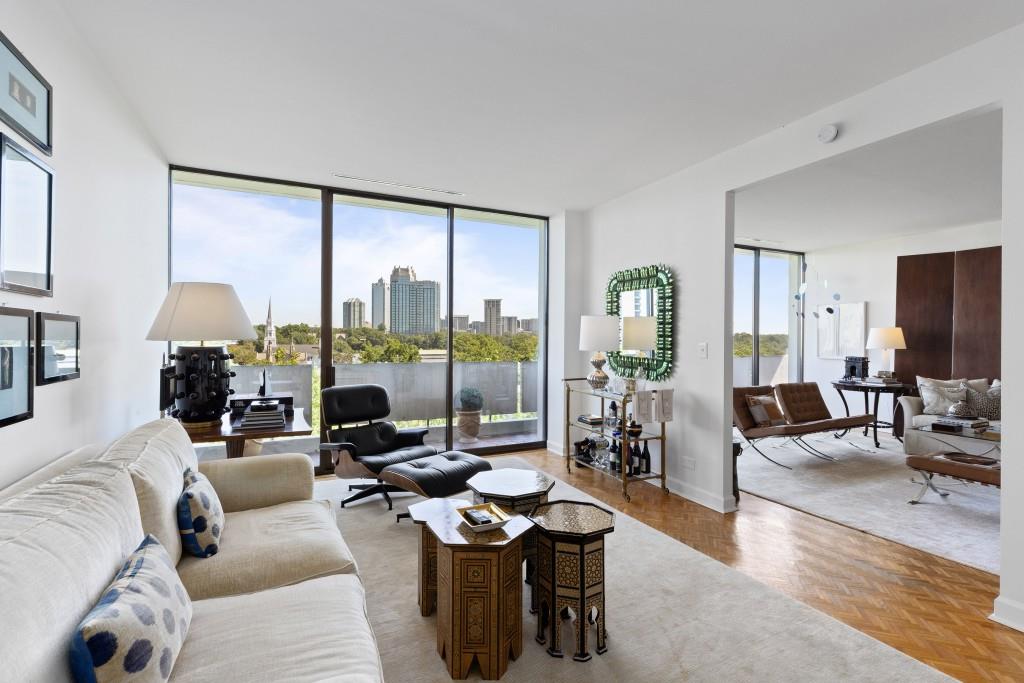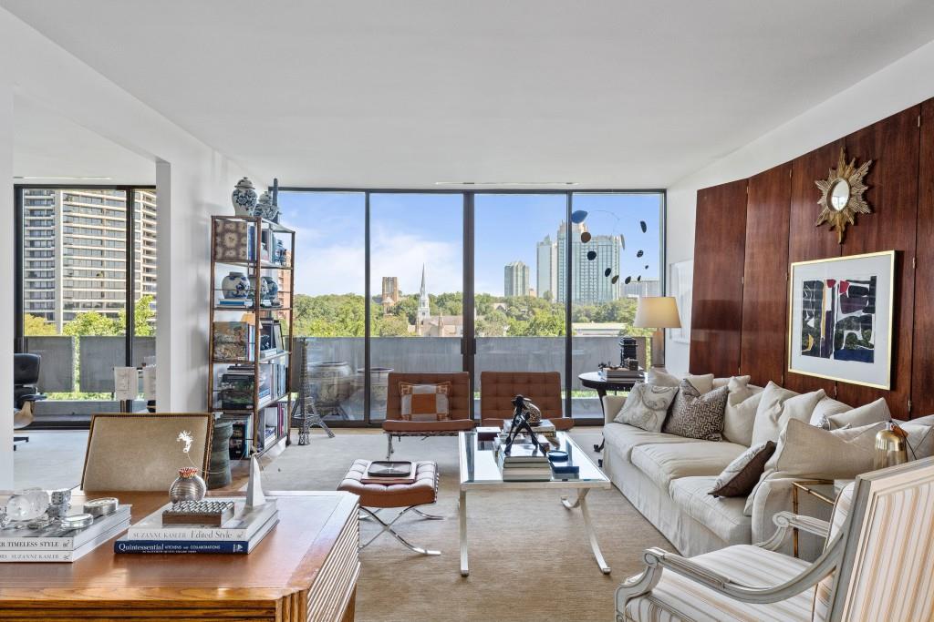 Welcome to Residence 14A at Plaza Towers, one of Atlanta's most iconic mid-century buildings designed by noted architect Ted Levy. This immaculate home has been fully renovated top to bottom, transforming a rare and expansive three-bedroom floor plan into a luxurious two-bedroom, two-and-a-half-bath residence with grand proportions, two distinct living areas, and a seamless open-concept kitchen and dining space that works beautifully for both entertaining and everyday living. Light pours in through floor-to-ceiling windows and brand-new glass doors that open onto two private balconies running the full length of each side of the home. Every inch of the residence reflects refined sophistication, from the refurbished original Hungarian point hardwood floors to the carefully curated designer lighting. The clean architectural lines and thoughtful layout offer gallery-style moments for art, books, and collections while maintaining an inviting sense of comfort. The crisp white kitchen is sleek and functional with integrated appliances, custom cabinetry, and a large island with bar seating. Both bedrooms are generously sized and well positioned for privacy, including a serene primary suite with sweeping skyline views, a walk-in closet, and a bold, impeccably designed en suite bath. Plaza Towers is a boutique community known for its timeless architecture, discretion, and exceptional service. Amenities include 24-hour concierge, a private gym, dog park, the Plaza Room for entertaining, a conference room, and gated garage parking. Located in the heart of Buckhead, this is sophisticated city living at its finest.
