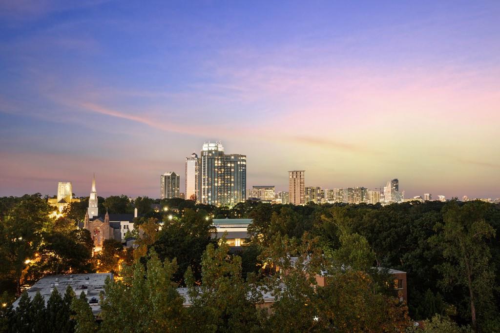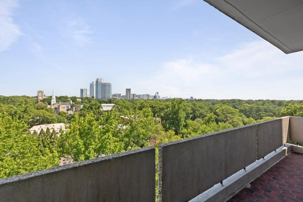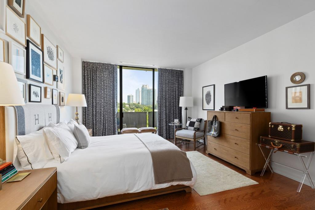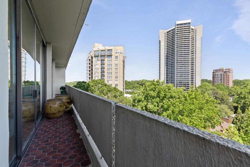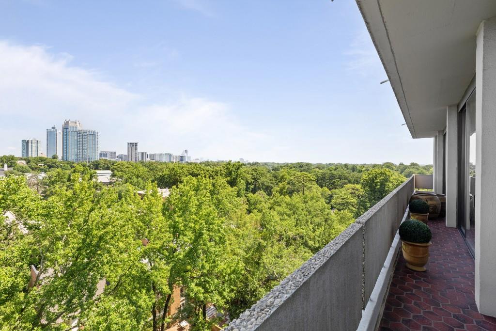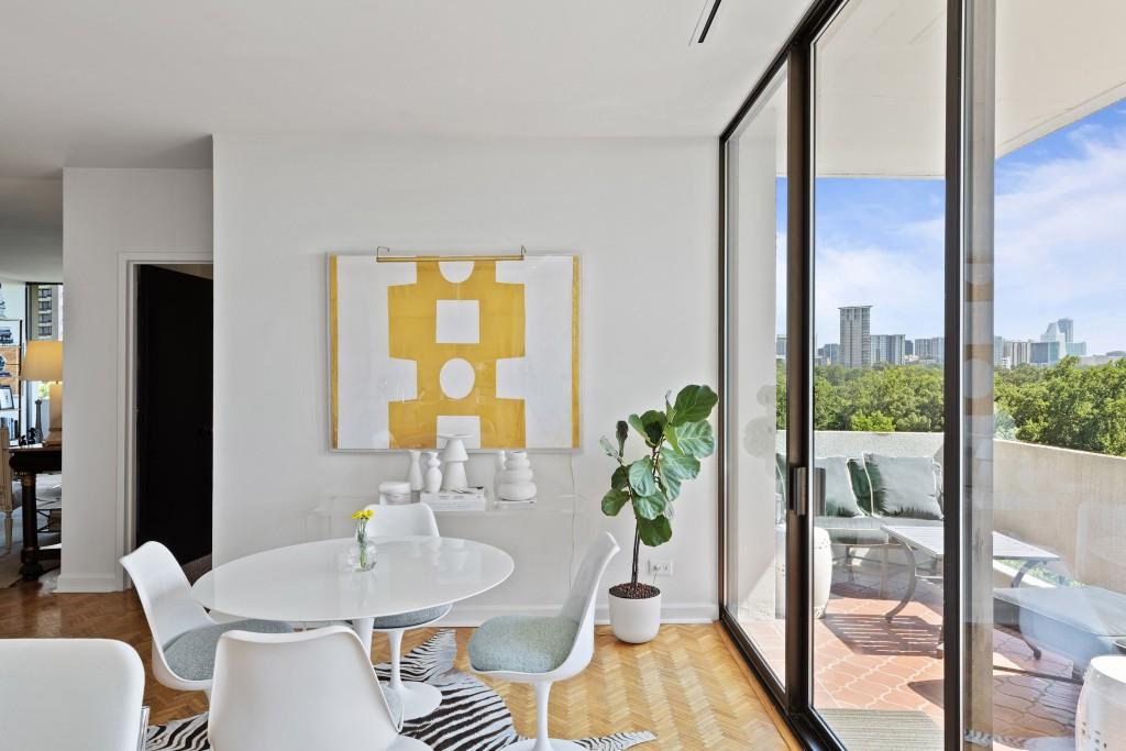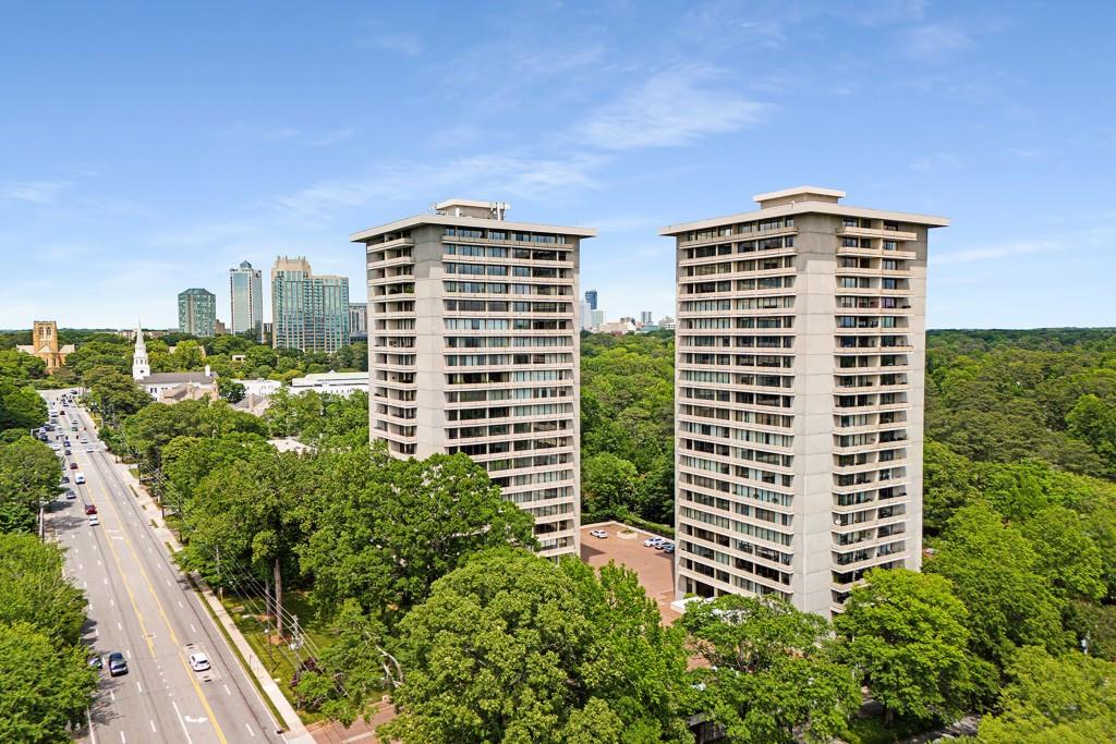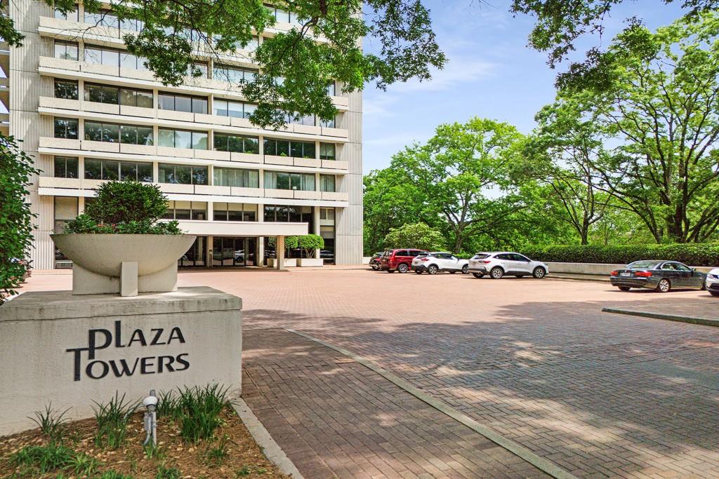 Welcome to Residence 14A at Plaza Towers, one of Atlanta's most iconic mid-century buildings designed by noted architect Ted Levy. This immaculate home has been fully renovated top to bottom, transforming a rare and expansive three-bedroom floor plan into a luxurious two-bedroom, two-and-a-half-bath residence with grand proportions, two distinct living areas, and a seamless open-concept kitchen and dining space that works beautifully for both entertaining and everyday living. Light pours in through floor-to-ceiling windows and brand-new glass doors that open onto two private balconies running the full length of each side of the home. Every inch of the residence reflects refined sophistication, from the refurbished original Hungarian point hardwood floors to the carefully curated designer lighting. The clean architectural lines and thoughtful layout offer gallery-style moments for art, books, and collections while maintaining an inviting sense of comfort. The crisp white kitchen is sleek and functional with integrated appliances, custom cabinetry, and a large island with bar seating. Both bedrooms are generously sized and well positioned for privacy, including a serene primary suite with sweeping skyline views, a walk-in closet, and a bold, impeccably designed en suite bath. Plaza Towers is a boutique community known for its timeless architecture, discretion, and exceptional service. Amenities include 24-hour concierge, a private gym, dog park, the Plaza Room for entertaining, a conference room, and gated garage parking. Located in the heart of Buckhead, this is sophisticated city living at its finest.