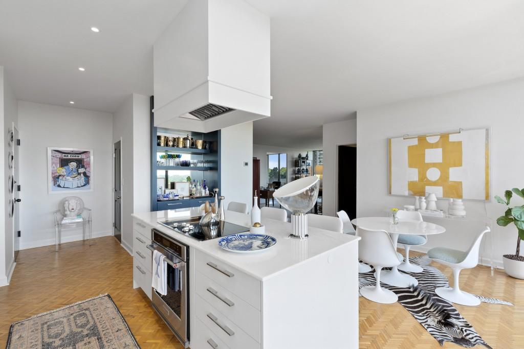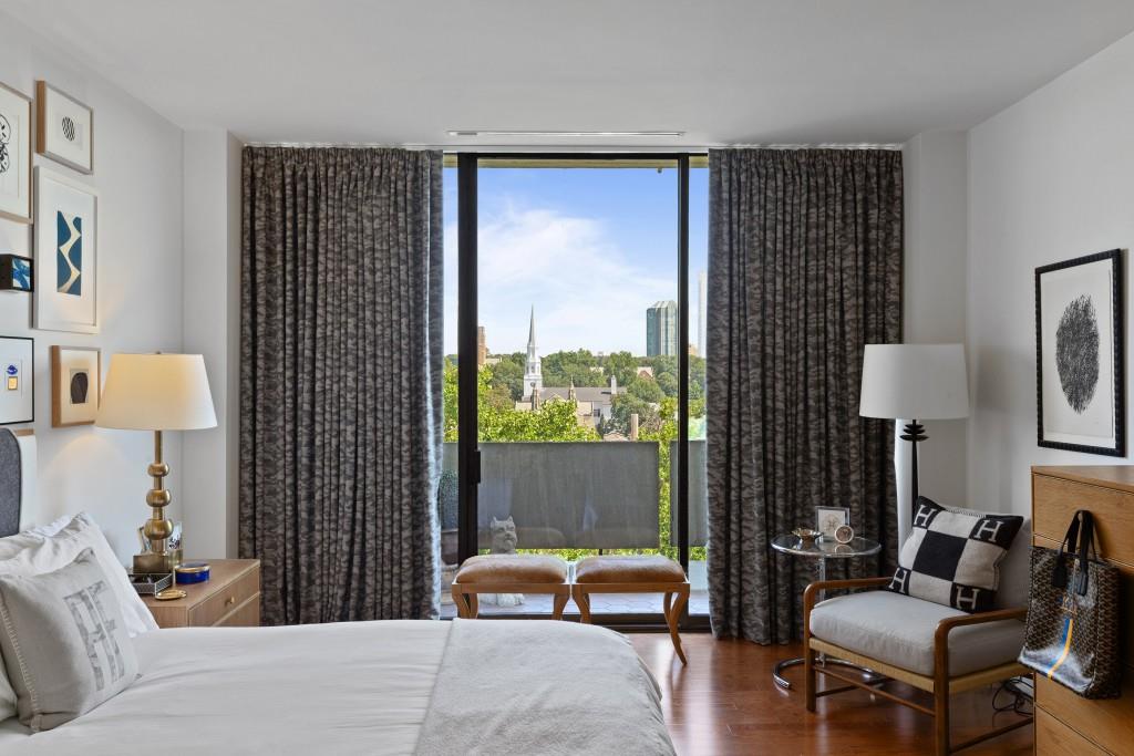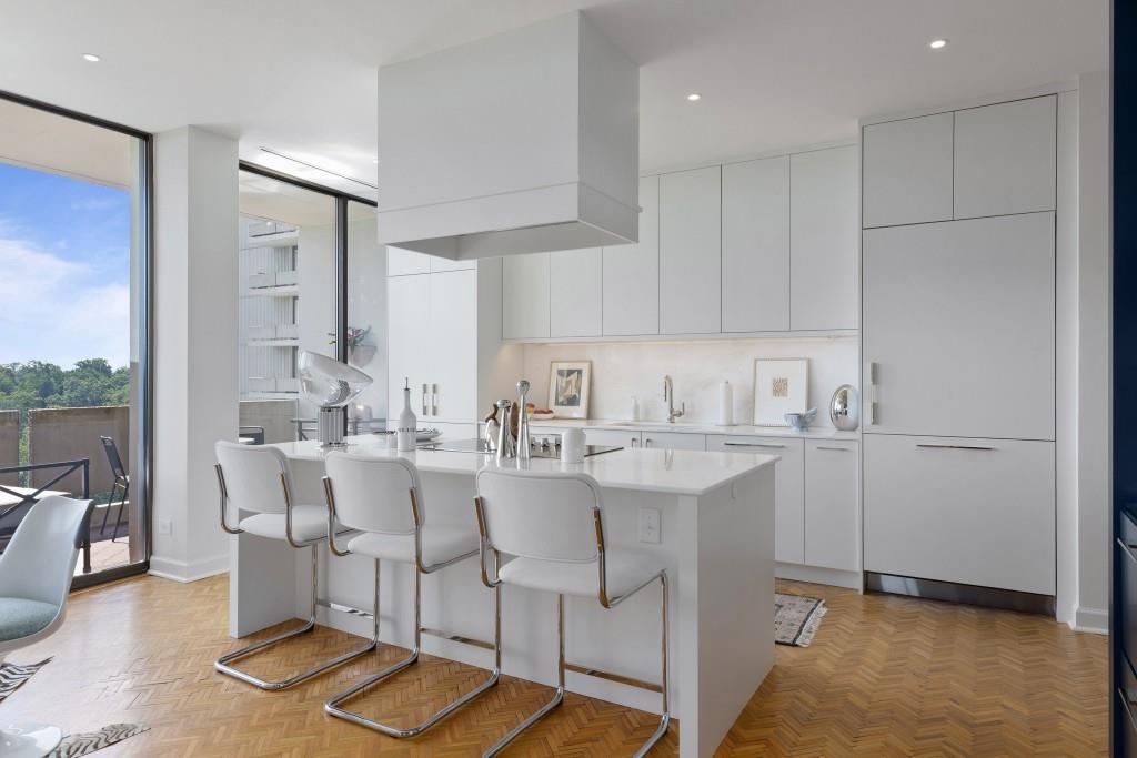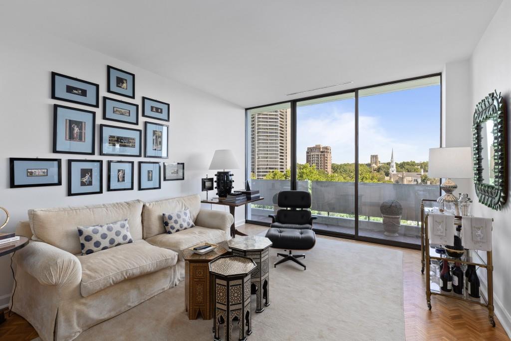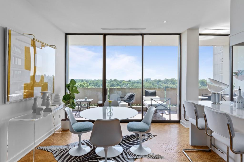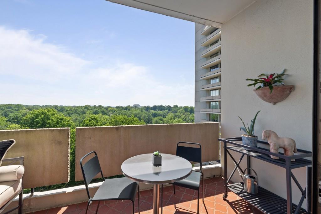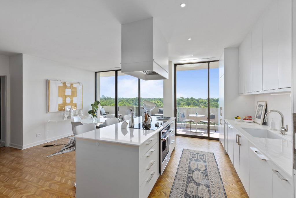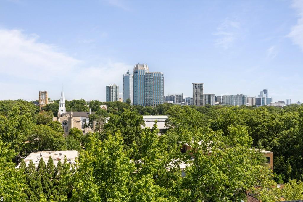 Welcome to Residence 14A at Plaza Towers, one of Atlanta's most iconic mid-century buildings designed by noted architect Ted Levy. This immaculate home has been fully renovated top to bottom, transforming a rare and expansive three-bedroom floor plan into a luxurious two-bedroom, two-and-a-half-bath residence with grand proportions, two distinct living areas, and a seamless open-concept kitchen and dining space that works beautifully for both entertaining and everyday living. Light pours in through floor-to-ceiling windows and brand-new glass doors that open onto two private balconies running the full length of each side of the home. Every inch of the residence reflects refined sophistication, from the refurbished original Hungarian point hardwood floors to the carefully curated designer lighting. The clean architectural lines and thoughtful layout offer gallery-style moments for art, books, and collections while maintaining an inviting sense of comfort. The crisp white kitchen is sleek and functional with integrated appliances, custom cabinetry, and a large island with bar seating. Both bedrooms are generously sized and well positioned for privacy, including a serene primary suite with sweeping skyline views, a walk-in closet, and a bold, impeccably designed en suite bath. Plaza Towers is a boutique community known for its timeless architecture, discretion, and exceptional service. Amenities include 24-hour concierge, a private gym, dog park, the Plaza Room for entertaining, a conference room, and gated garage parking. Located in the heart of Buckhead, this is sophisticated city living at its finest.