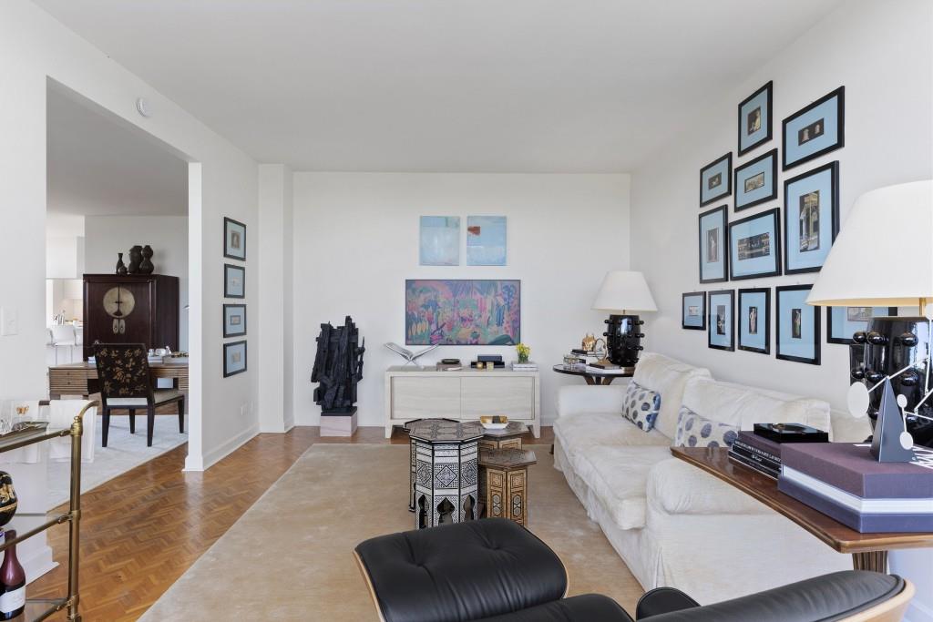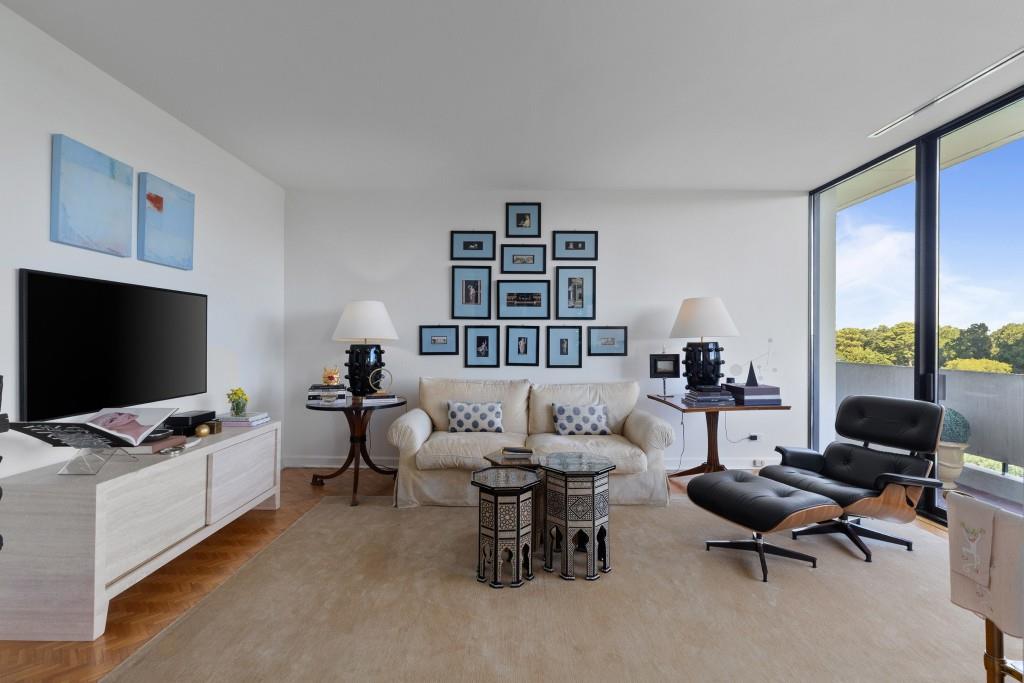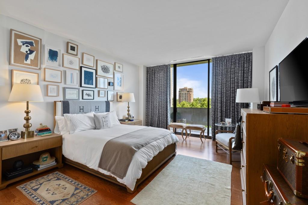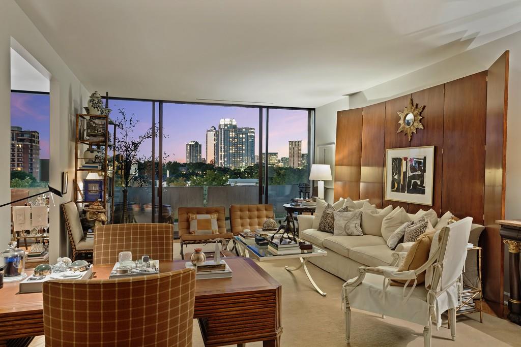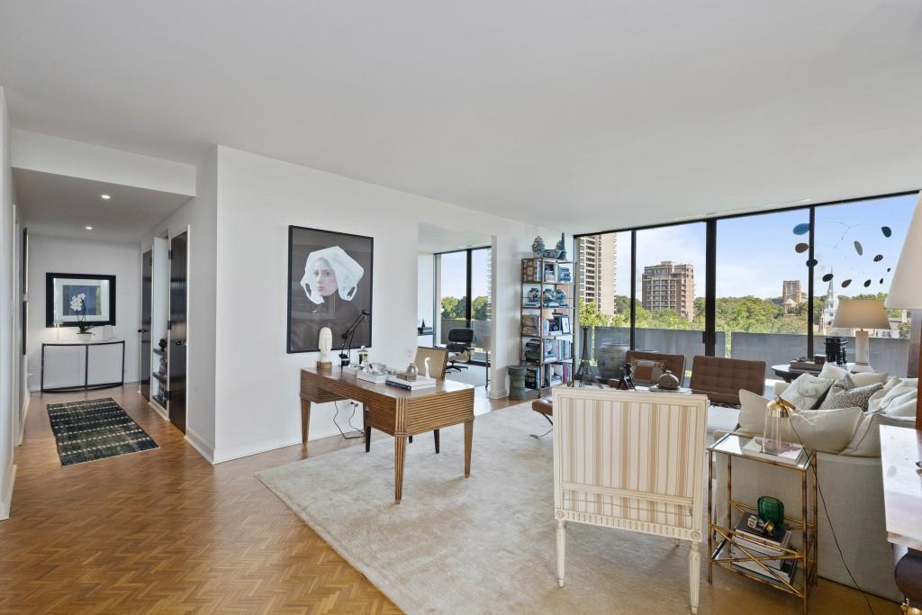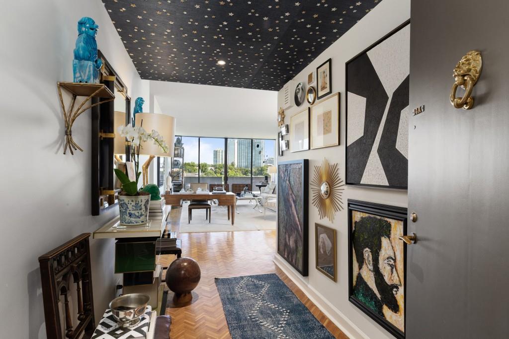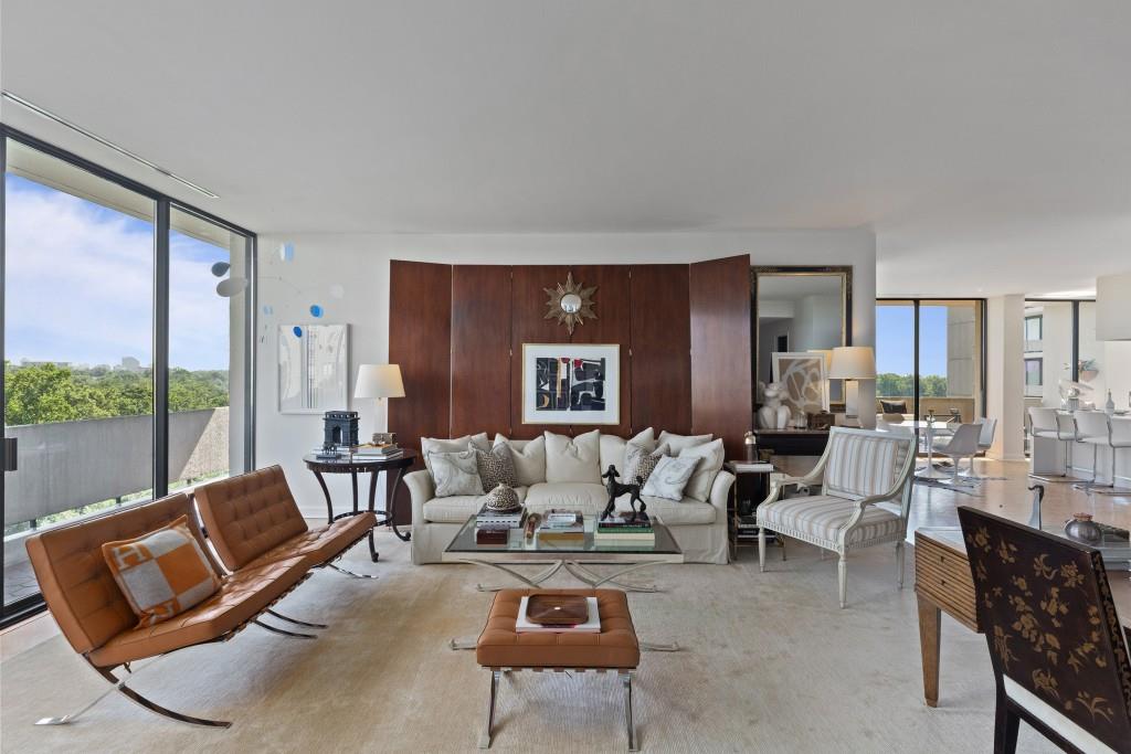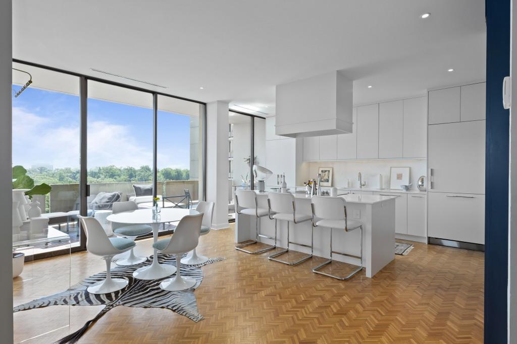 Welcome to Residence 14A at Plaza Towers, one of Atlanta's most iconic mid-century buildings designed by noted architect Ted Levy. This immaculate home has been fully renovated top to bottom, transforming a rare and expansive three-bedroom floor plan into a luxurious two-bedroom, two-and-a-half-bath residence with grand proportions, two distinct living areas, and a seamless open-concept kitchen and dining space that works beautifully for both entertaining and everyday living. Light pours in through floor-to-ceiling windows and brand-new glass doors that open onto two private balconies running the full length of each side of the home. Every inch of the residence reflects refined sophistication, from the refurbished original Hungarian point hardwood floors to the carefully curated designer lighting. The clean architectural lines and thoughtful layout offer gallery-style moments for art, books, and collections while maintaining an inviting sense of comfort. The crisp white kitchen is sleek and functional with integrated appliances, custom cabinetry, and a large island with bar seating. Both bedrooms are generously sized and well positioned for privacy, including a serene primary suite with sweeping skyline views, a walk-in closet, and a bold, impeccably designed en suite bath. Plaza Towers is a boutique community known for its timeless architecture, discretion, and exceptional service. Amenities include 24-hour concierge, a private gym, dog park, the Plaza Room for entertaining, a conference room, and gated garage parking. Located in the heart of Buckhead, this is sophisticated city living at its finest.