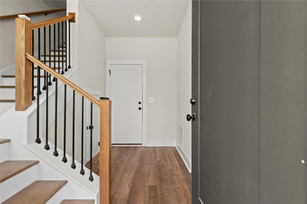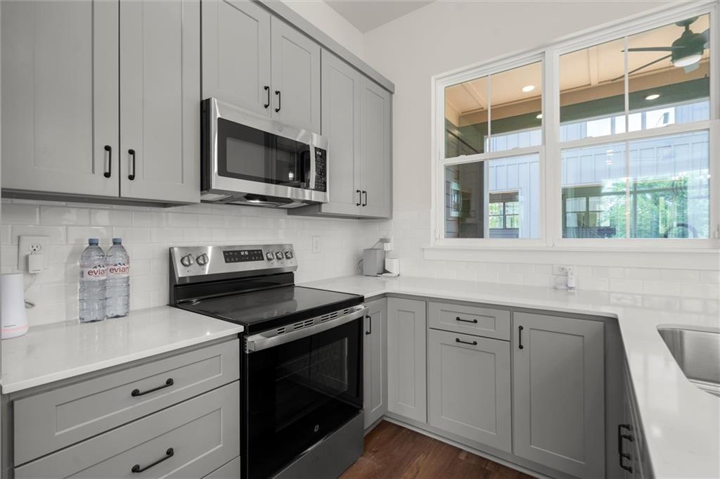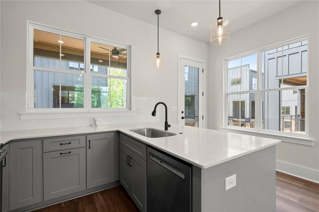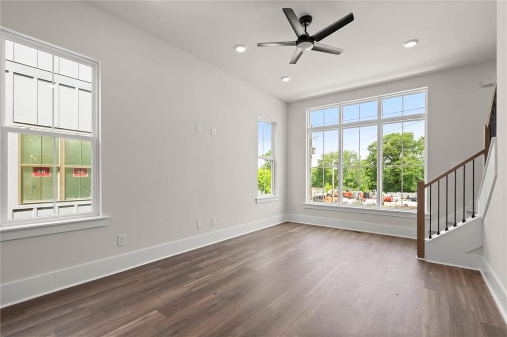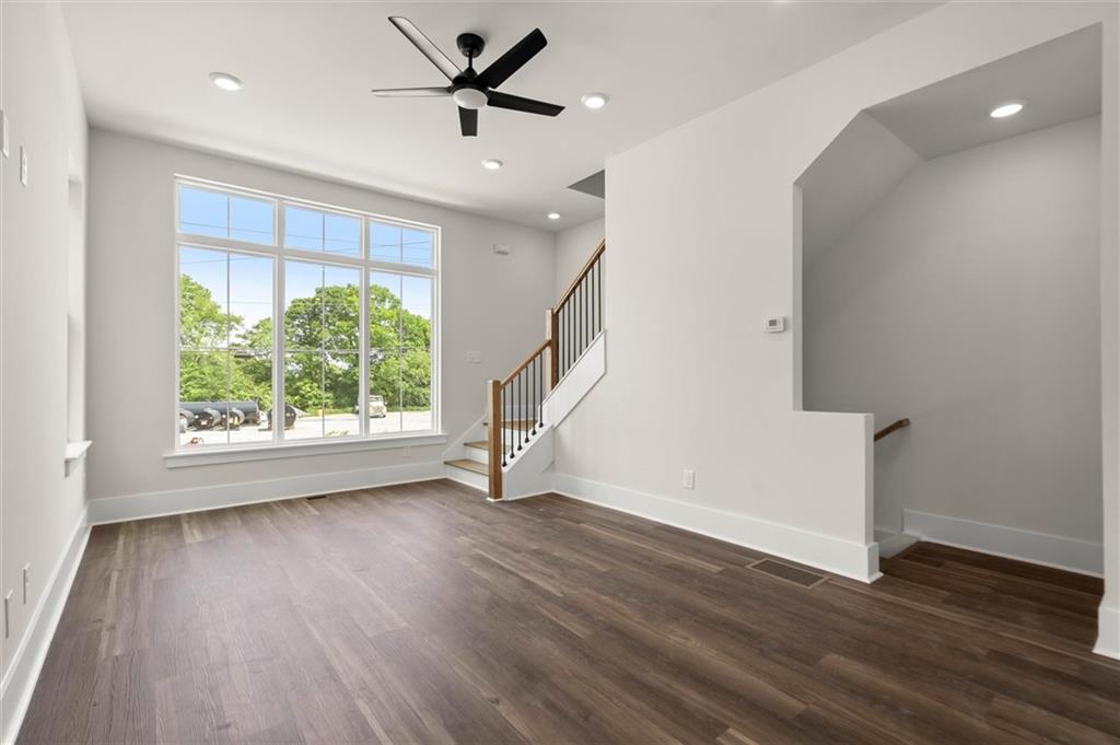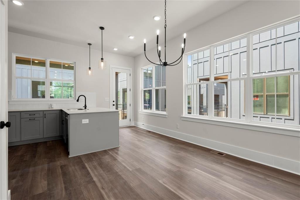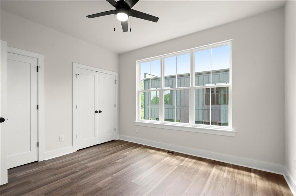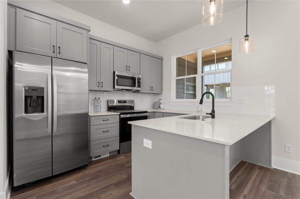 Knights Walk at Howell Station, where every unit is an end unit. These brick and batten board clad, fee simple CityHomes are the latest offering from Middle Housing Company. Abundant natural light is provided by windows on three sides of every unit. Real usable outdoor space is found on the large, covered deck adjacent to the kitchen, while front units facing West Marietta St include a front patio as well. The lower level includes a half bath and a single-car garage with extra storage. The main level includes a great room with living and dining areas, a well-appointed kitchen, and a covered rear deck. The light-filled upper level has a primary suite with ensuite bathroom with double vanity, large floor-to-ceiling tile shower, and a separate water closet. The secondary bedroom, bathroom, and laundry closet complete the upper level. Floors are durable luxury vinyl throughout the unit, and all countertops are quartz. Two different kitchen layouts are available. Knight Walk at Howell Station includes a dog walk and a community common area. This walkable location is only blocks away from Knight Park, the Beltline entrance adjacent to Westside Paper and King Plow.