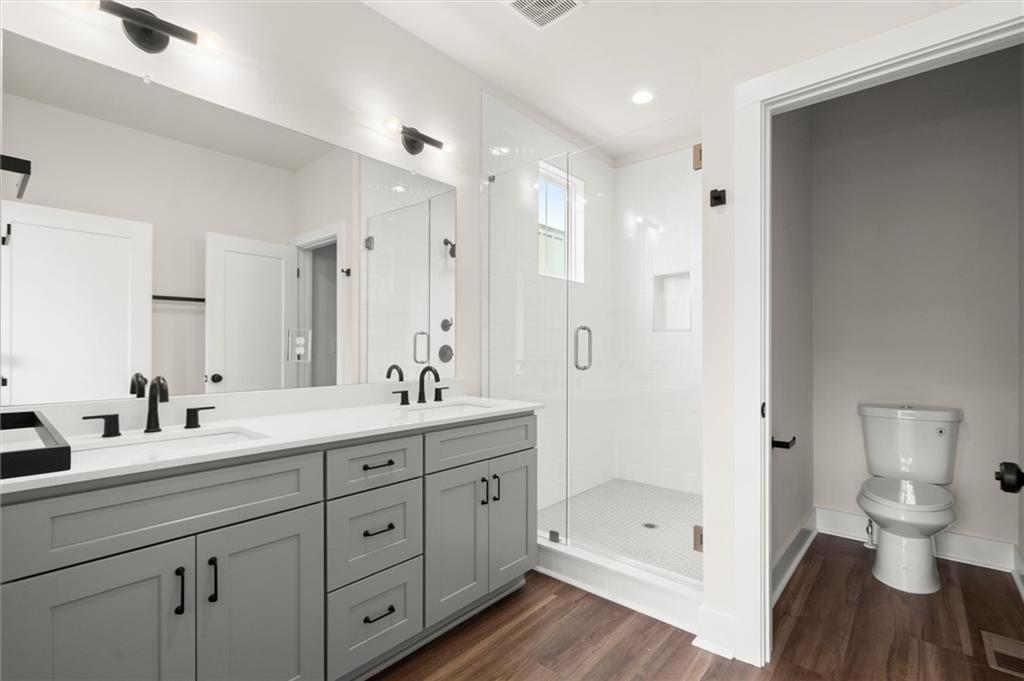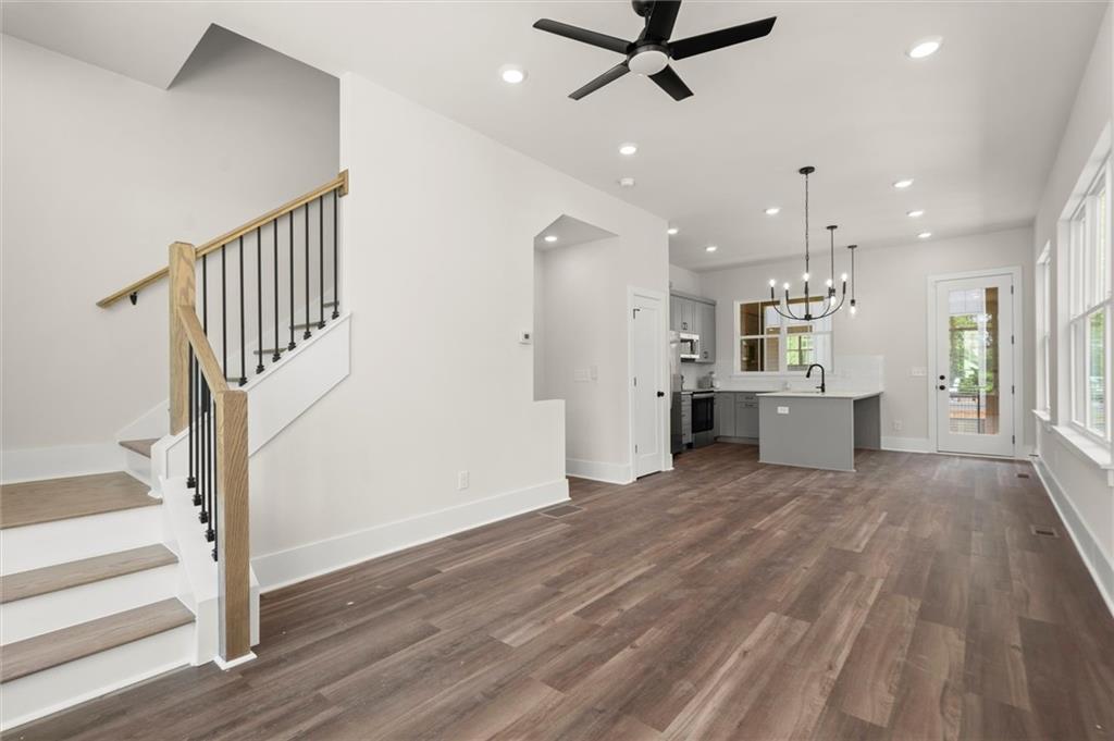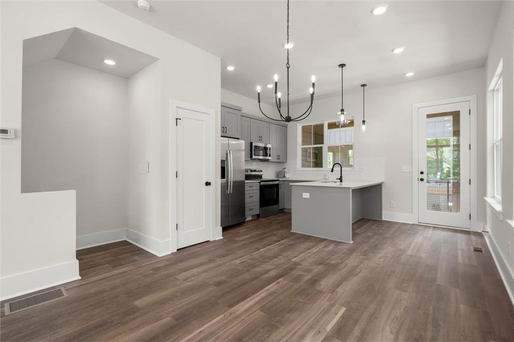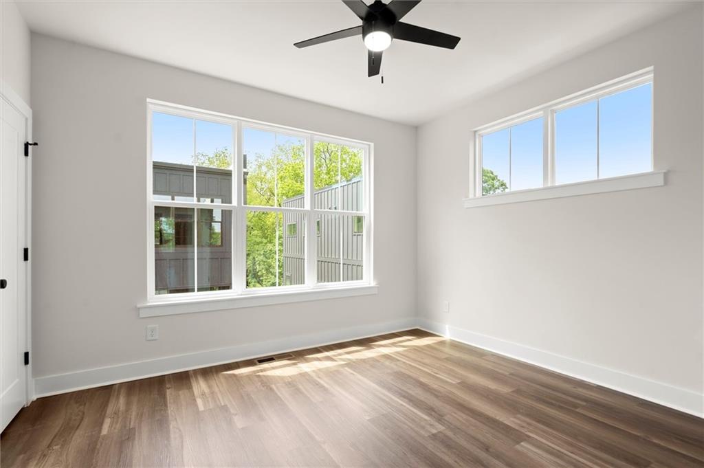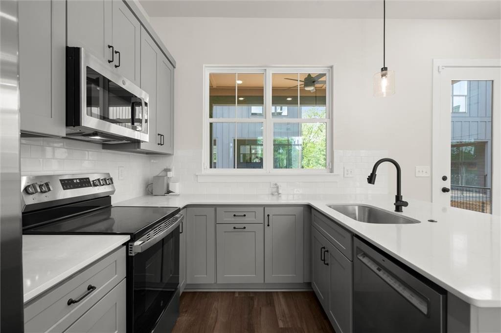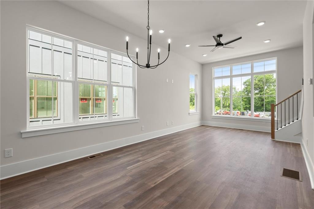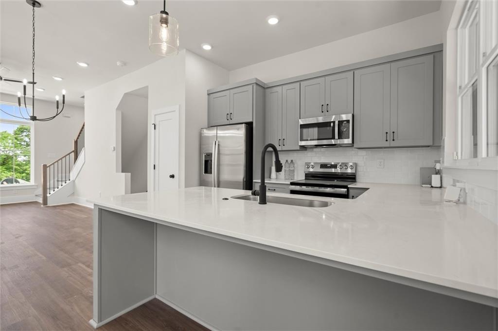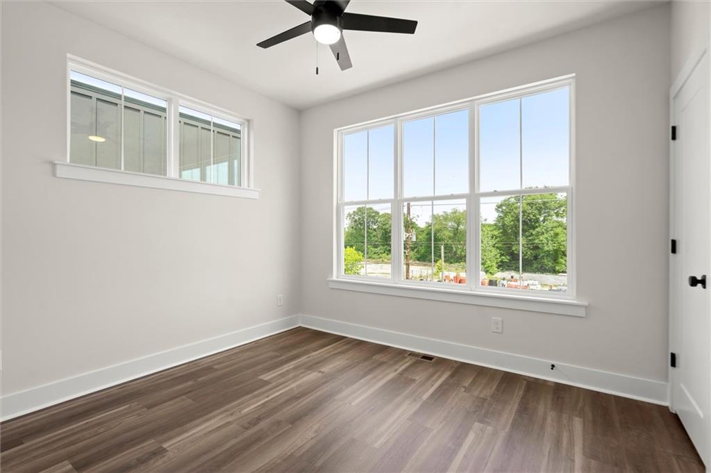 Knights Walk at Howell Station, where every unit is an end unit. These brick and batten board clad, fee simple CityHomes are the latest offering from Middle Housing Company. Abundant natural light is provided by windows on three sides of every unit. Real usable outdoor space is found on the large, covered deck adjacent to the kitchen, while front units facing West Marietta St include a front patio as well. The lower level includes a half bath and a single-car garage with extra storage. The main level includes a great room with living and dining areas, a well-appointed kitchen, and a covered rear deck. The light-filled upper level has a primary suite with ensuite bathroom with double vanity, large floor-to-ceiling tile shower, and a separate water closet. The secondary bedroom, bathroom, and laundry closet complete the upper level. Floors are durable luxury vinyl throughout the unit, and all countertops are quartz. Two different kitchen layouts are available. Knight Walk at Howell Station includes a dog walk and a community common area. This walkable location is only blocks away from Knight Park, the Beltline entrance adjacent to Westside Paper and King Plow.