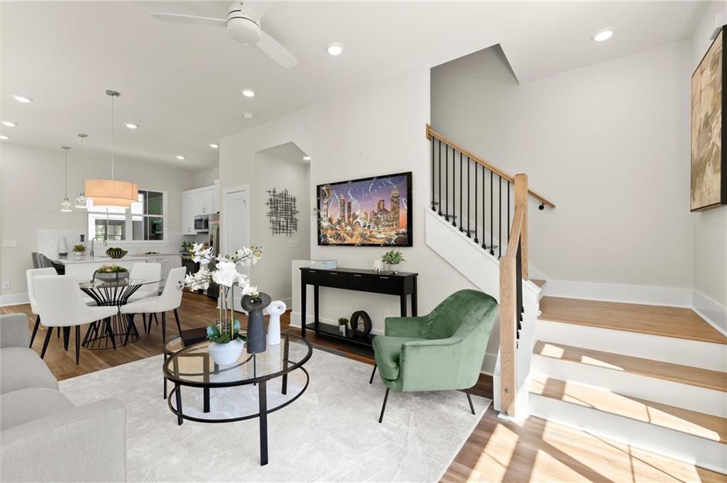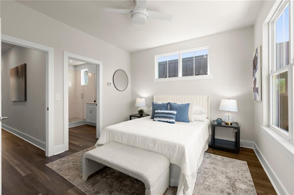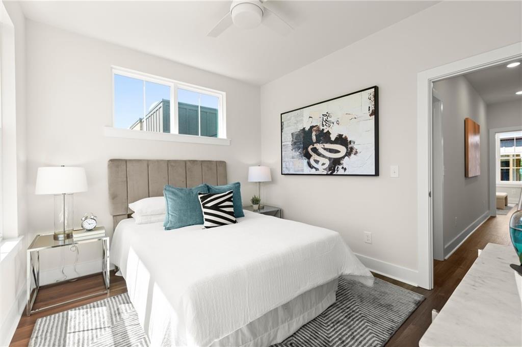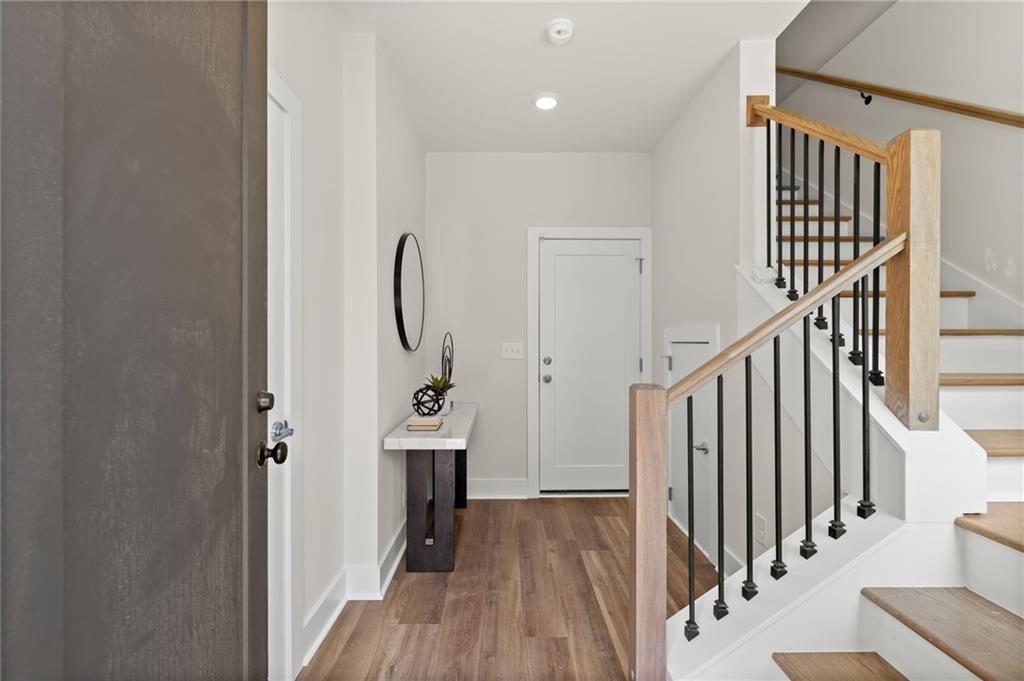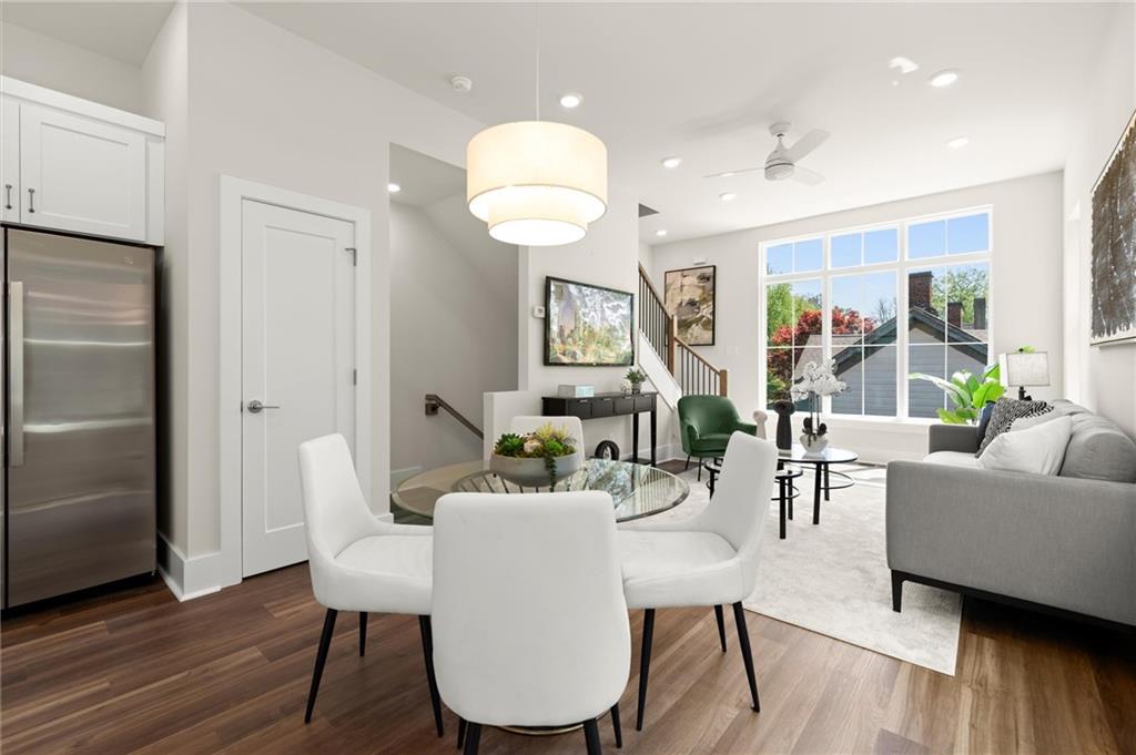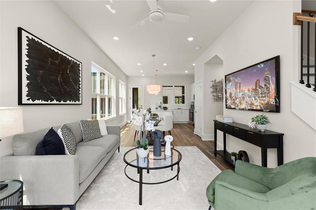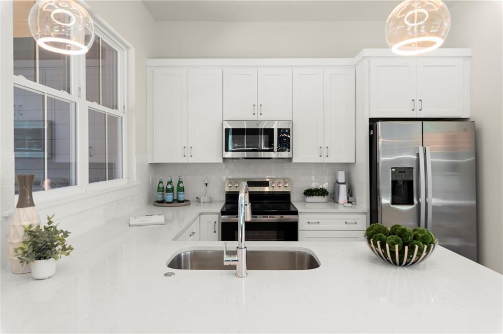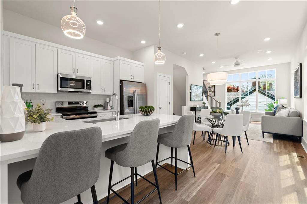 Knights Walk at Howell Station, where every unit is an end unit. These brick and batten board clad, fee simple CityHomes are the latest offering from Middle Housing Company. Abundant natural light is provided by windows on three sides of every unit. Real usable outdoor space is found on the large, covered deck adjacent to the kitchen, while front units facing West Marietta St include a front patio as well. The lower level includes a half bath and a single-car garage with extra storage. The main level includes a great room with living and dining areas, a well-appointed kitchen, and a covered rear deck. The light-filled upper level has a primary suite with ensuite bathroom with double vanity, large floor-to-ceiling tile shower, and a separate water closet. The secondary bedroom, bathroom, and laundry closet complete the upper level. Floors are durable luxury vinyl throughout the unit, and all countertops are quartz. Two different kitchen layouts are available. Knight Walk at Howell Station includes a dog walk and a community common area. This walkable location is only blocks away from Knight Park, the Beltline entrance adjacent to Westside Paper and King Plow.