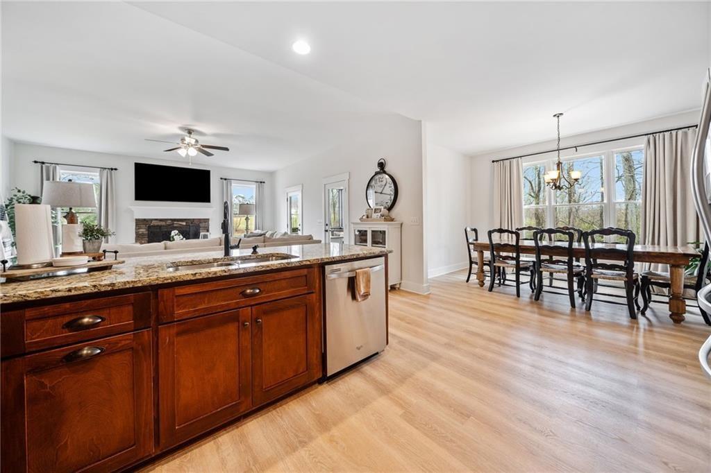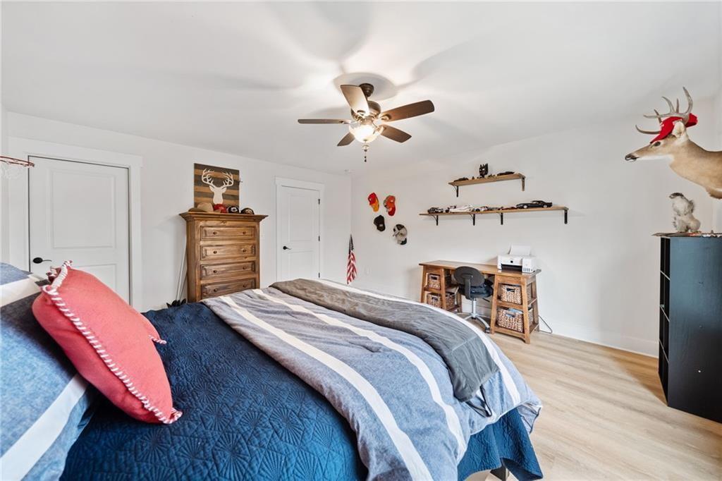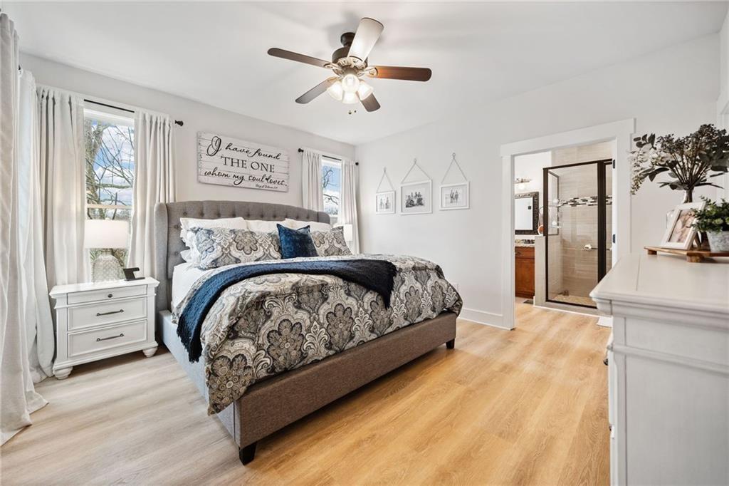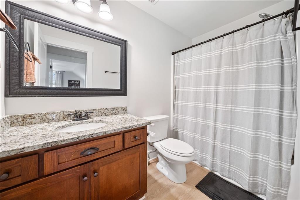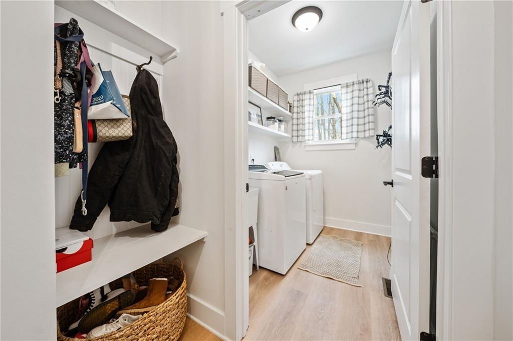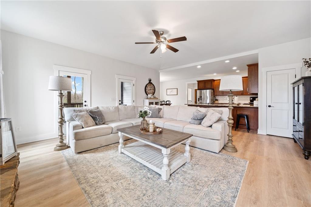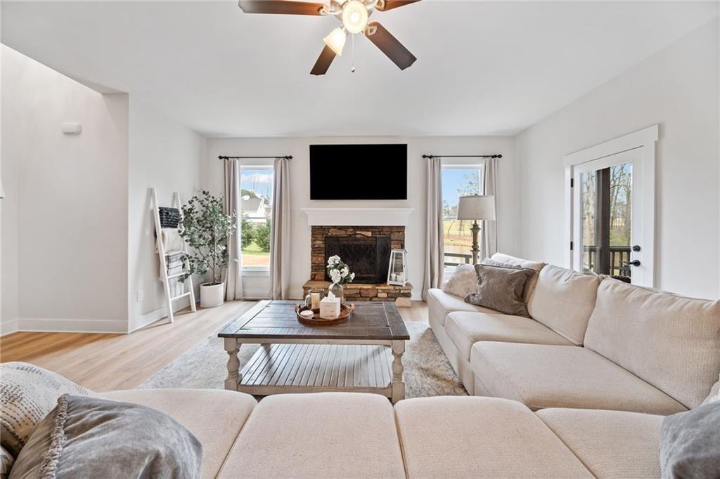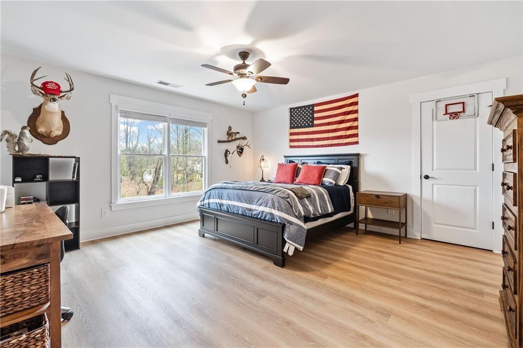 Experience the perfect mix of comfort, privacy, and natural beauty in this custom-built retreat. Tucked away on two peaceful acres with its own pond and dock, this home offers a truly serene setting—ideal for fishing, kayaking, or simply relaxing by the water. Step onto the charming covered front porch, the perfect spot to unwind and enjoy the quiet surroundings. Inside, you'll find stylish LVP flooring throughout (no carpet!), leading into a spacious, open layout. The family room is a warm and inviting space, featuring a stunning stone fireplace surrounded by windows that fill the room with natural light and beautiful views of the property. The kitchen is a chef’s dream, featuring granite countertops, a tile backsplash, stainless steel appliances, and plenty of prep space. The formal dining room is perfect for hosting family or friends, while the mudroom adds everyday practicality. The main-level primary suite features a spa-like bath offering dual vanities, a garden tub, a large tiled walk-in shower, and spacious walk-in closet. Upstairs, you’ll find three oversized bedrooms, all with LVP flooring, and a beautifully updated full bath. Plus, walkout attic space perfect for storing all your extra belongings. Enjoy peaceful mornings or quiet evenings from the screened-in back porch, overlooking a fully fenced backyard. Located in a desirable school district, this home offers it all. Just a short drive to Woodstock, Roswell, Alpharetta, with shopping and restaurants all close by.