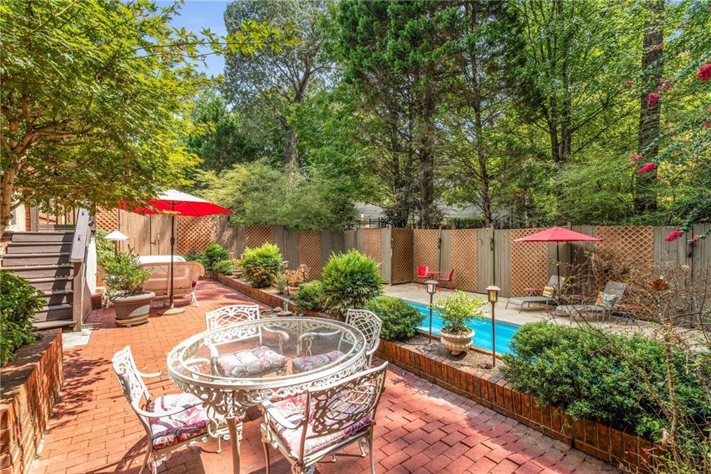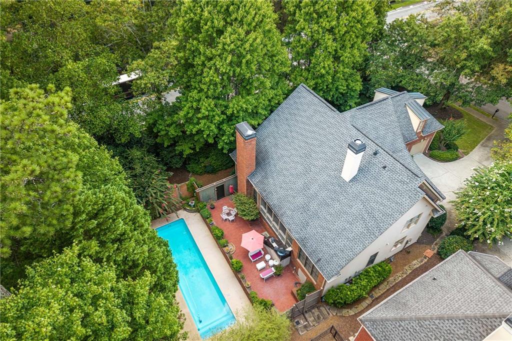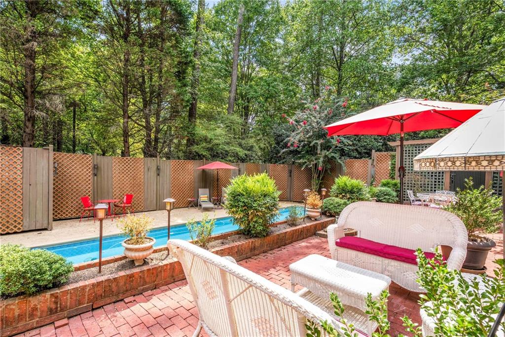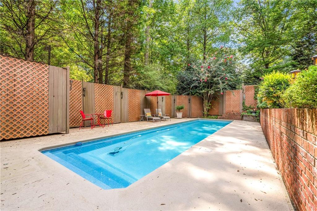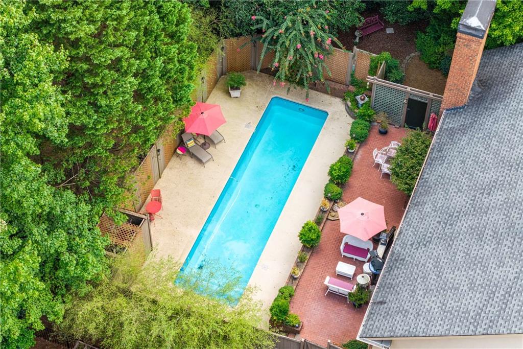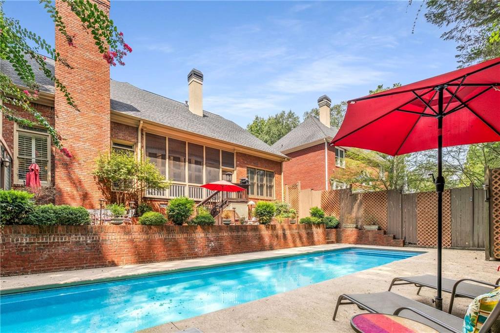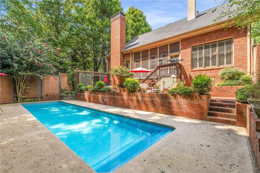 HIGH POINT PLACE/ ITP SANDY SPRINGS: Picture perfect three sides brick traditional with heated saltwater pool suitable for laps. Rich details abound with wood and gas fireplaces, custom upgraded molding and wainscotting, coffered and tray ceilings, beautiful solid oak wood floors on main, custom wood interior shutters, recessed lighting, and solid wood interior doors. Aged copper roofed front porch leads to double entry doors. Welcoming entrance foyer with a coat closet. Expansive living room has floor to ceiling windows, a gas fireplace with gas logs, built in bookshelves, and coffered 11 foot ceilings. Separate dining room with wainscotting. Family / keeping room boasts French doors to the screen porch, a wood burning fireplace with gas starter, and 11 foot coffered ceilings. Screen porch overlooks the courtyard back yard and the pool. Extended multi-level brick patio and pool area are an entertainer’s dream. Back yard has high privacy fencing. Kitchen features white cabinets and white countertops, a peninsula and an island, gas cooktop, stainless steel wall oven, built-in microwave, side by side refrigerator, and multiple pantry closets. Breakfast area connects the kitchen and the family room. Main floor primary bedroom suite is oversized with a tray ceiling, two walk-in closets, and another set of French doors that open directly to the screen porch. Primary bathroom is amply sized and has double sinks, air bubble soaking tub, frameless glass shower, and a separate water closet. 4 bedrooms are privately located on the upper floor. 2 bedrooms share a Jack and Jill bath. A Bonus room adjoins one of the bedrooms. An oversized bedroom could easily function as an upstairs family room. The third and fourth bedrooms also connect through a Jack and Jill bath. Powder room and laundry room with sink round out the main floor. Attached 2 car garage. Rainbird irrigation system serves the professionally and lushly landscaped yard. High Point Place is a peaceful cul-de-sac neighborhood with sidewalks and underground utilities full of traditional brick homes. Extremely desirable and convenient location in southern Sandy Springs with High Point Elementary just 3 blocks away, AJA around the corner, and only 5 minutes to Chastain Park.