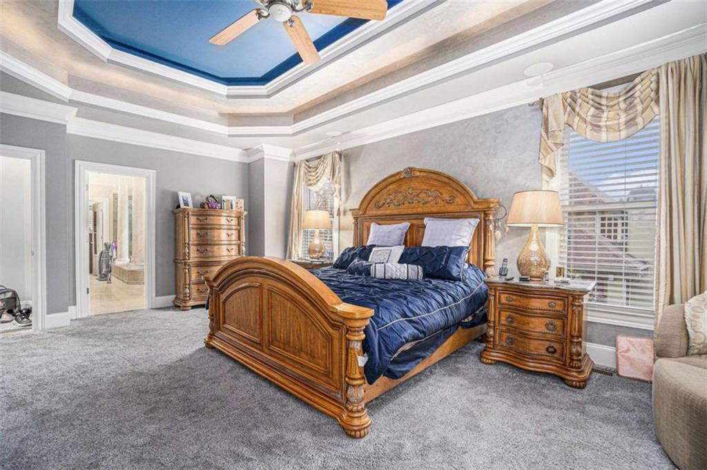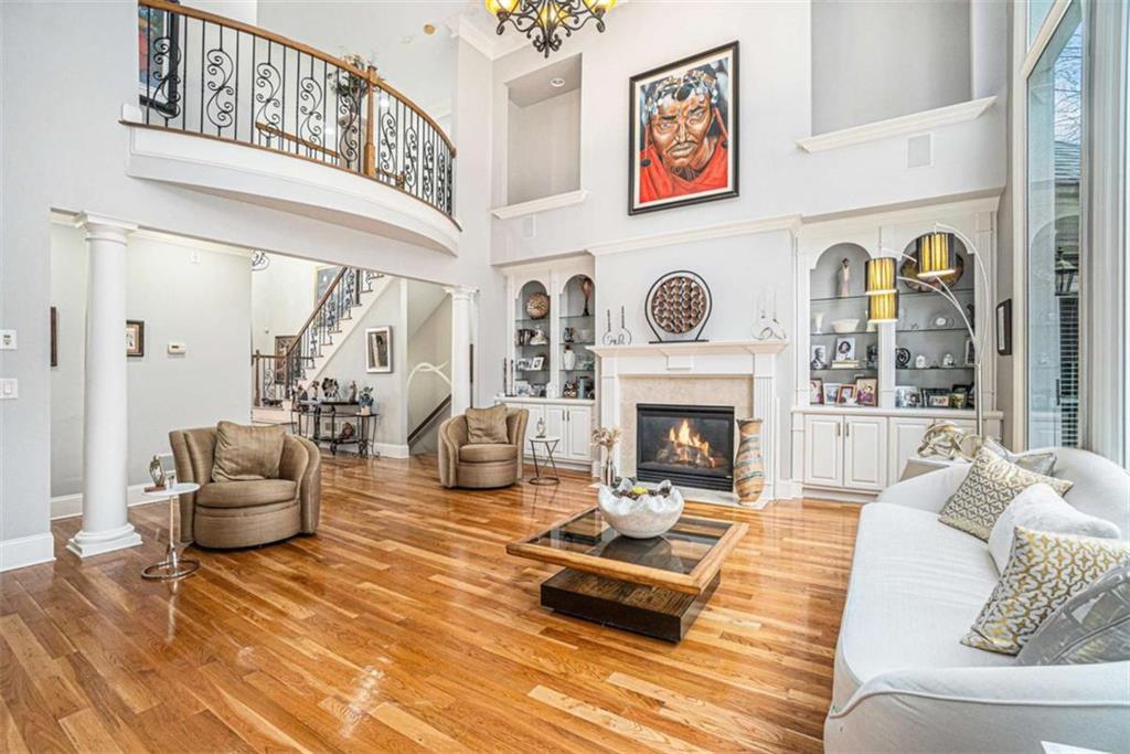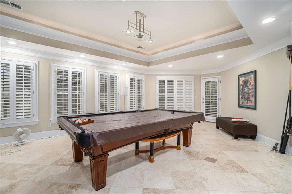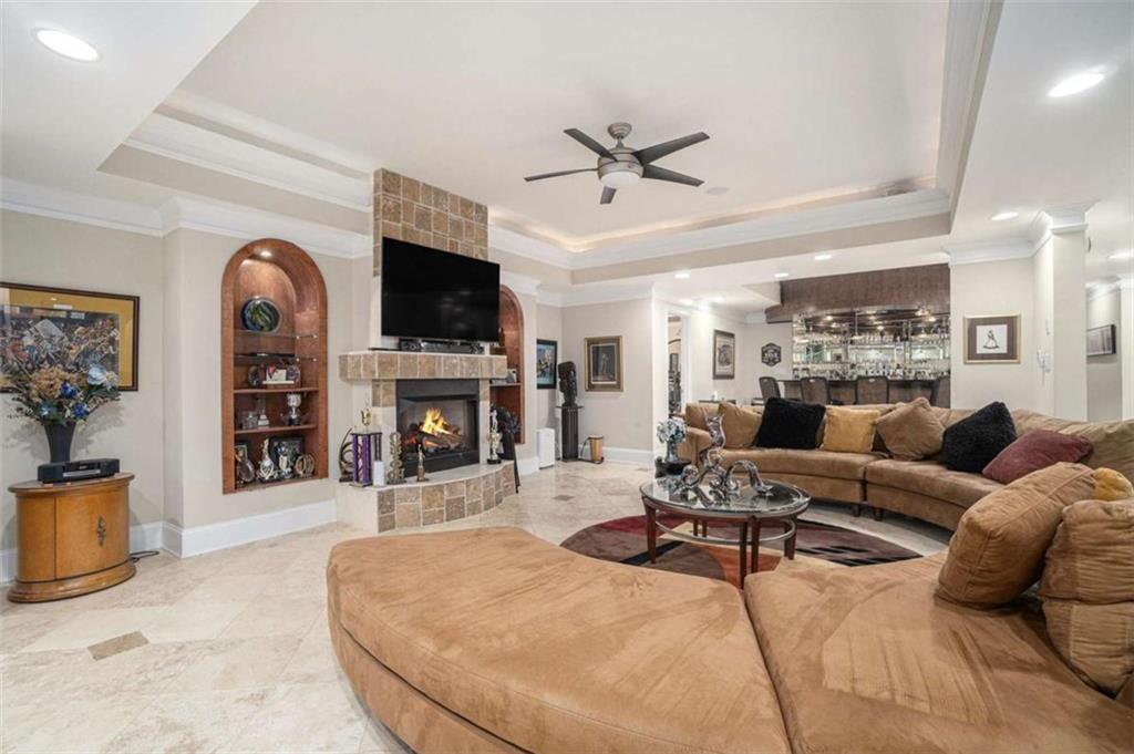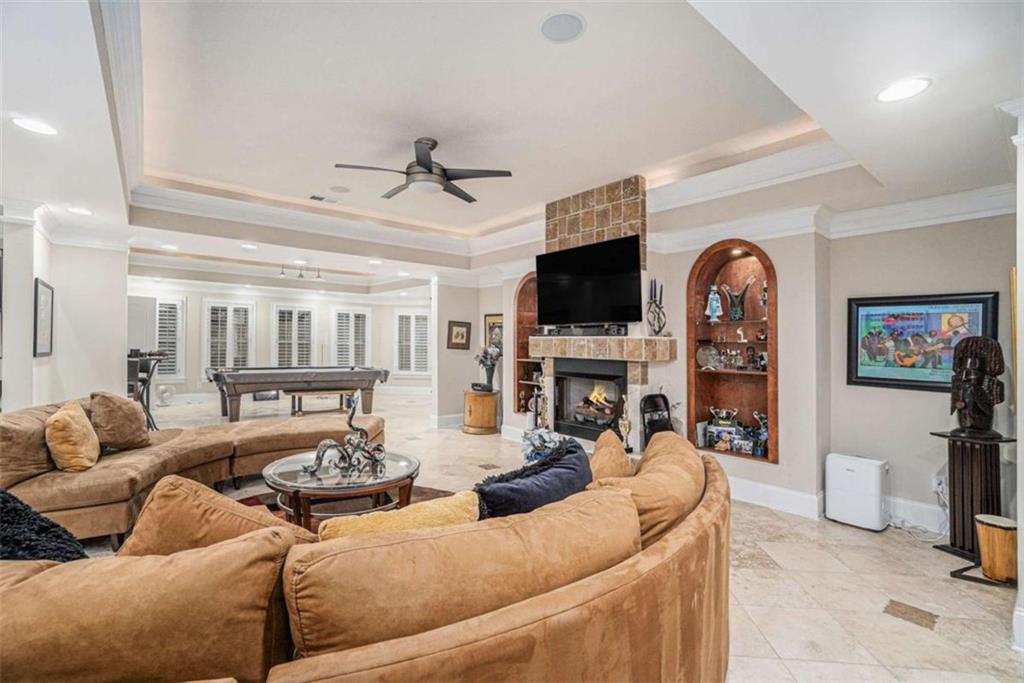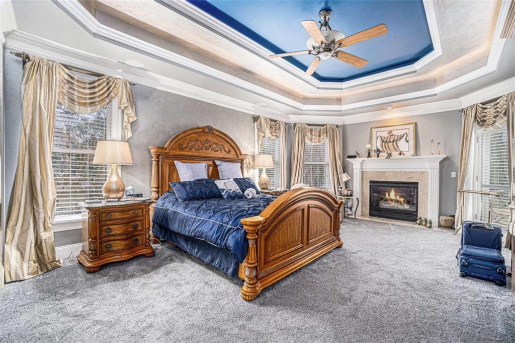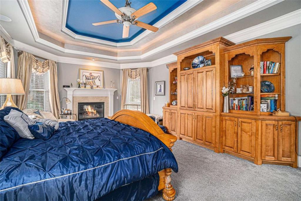 Luxury Living at Its Finest! Step into this stunning home featuring an inviting open foyer and a spacious dining room. The great room boasts floor-to-ceiling windows, a fireplace, and beautiful hardwood floors that flow seamlessly into the kitchen, which offers abundant custom cabinetry, and into the keeping room with an additional fireplace, perfect for entertaining. The gourmet kitchen is a chef's dream, complete with granite countertops, a 5-burner cooktop, a microwave/wall oven combo, an additional full-size oven, warming drawer, trash compactor, and a dishwasher. The kitchen opens into the keeping room, with a large laundry room located just off the kitchen, all thoughtfully connected for everyday living and effortless entertaining. The primary suite on the main level offers a private retreat with its own fireplace and a large spa-like bath featuring two dual-head showers with a built-in seat, an oversized whirlpool jacuzzi tub, and a fully customized walk-in closet. Upstairs, you'll find three en suite bedrooms plus a fourth bedroom that can function as a guest room or study, providing ample space for family and guests. A large “craft” room offers additional space for creative projects or flexible use. All closets throughout the home are custom-designed for optimal storage and luxury. This home also features an 18-speaker surround sound system installed throughout for easy listening or lively parties. The fully finished basement is an entertainer's paradise, showcasing a custom bar complete with a refrigerator, microwave, wine cooler, and dishwasher, plus a pool room, theater room, large entertainment room, an additional en suite bedroom, exercise room, cozy fireplace, powder room, and access to a lower level patio with a stairway leading up to the main level patio. Outdoor living is equally impressive, with a hot tub, putting green, and a beautiful fountain creating a serene escape. Modern conveniences include an electric car charging station, a central vacuum system, chandelier-lowering chains for effortless maintenance, and a second stairway from the garage to the lower level. Major upgrades include a new roof (2023) and a new water heater (2025). Don’t miss this exceptional home offering luxury, space, functionality, and thoughtful upgrades at every turn!