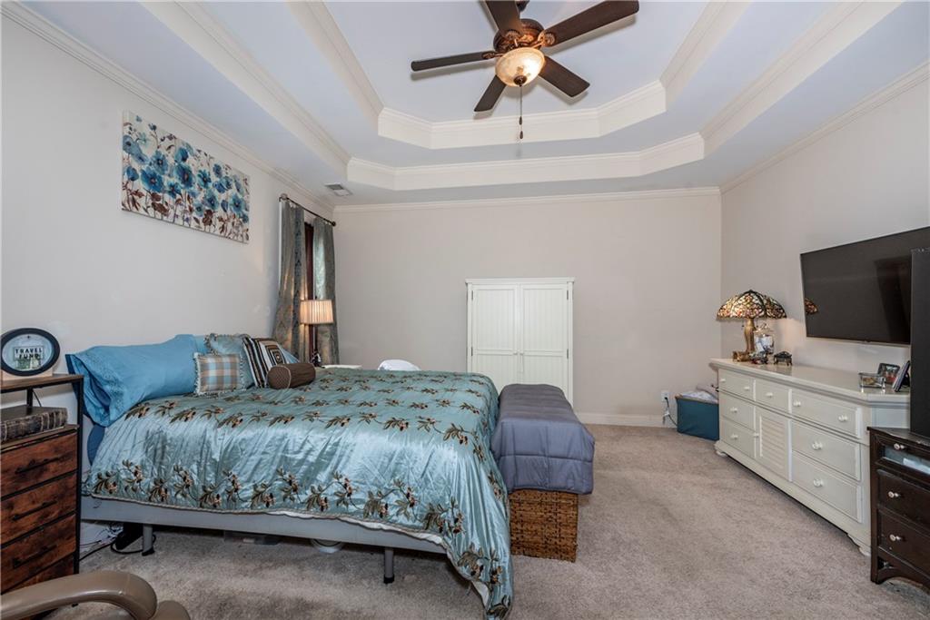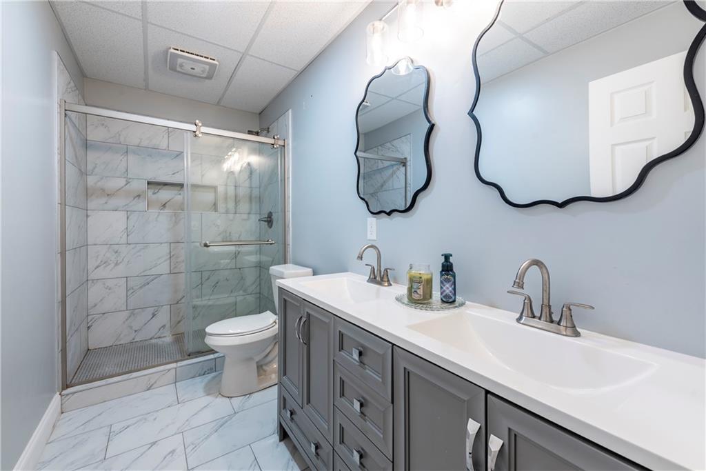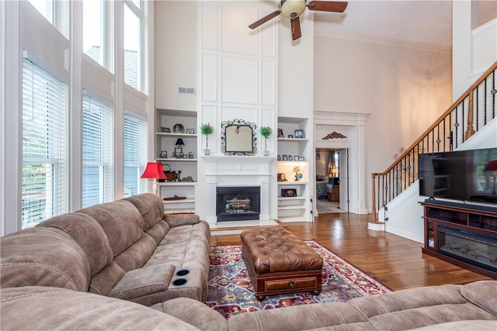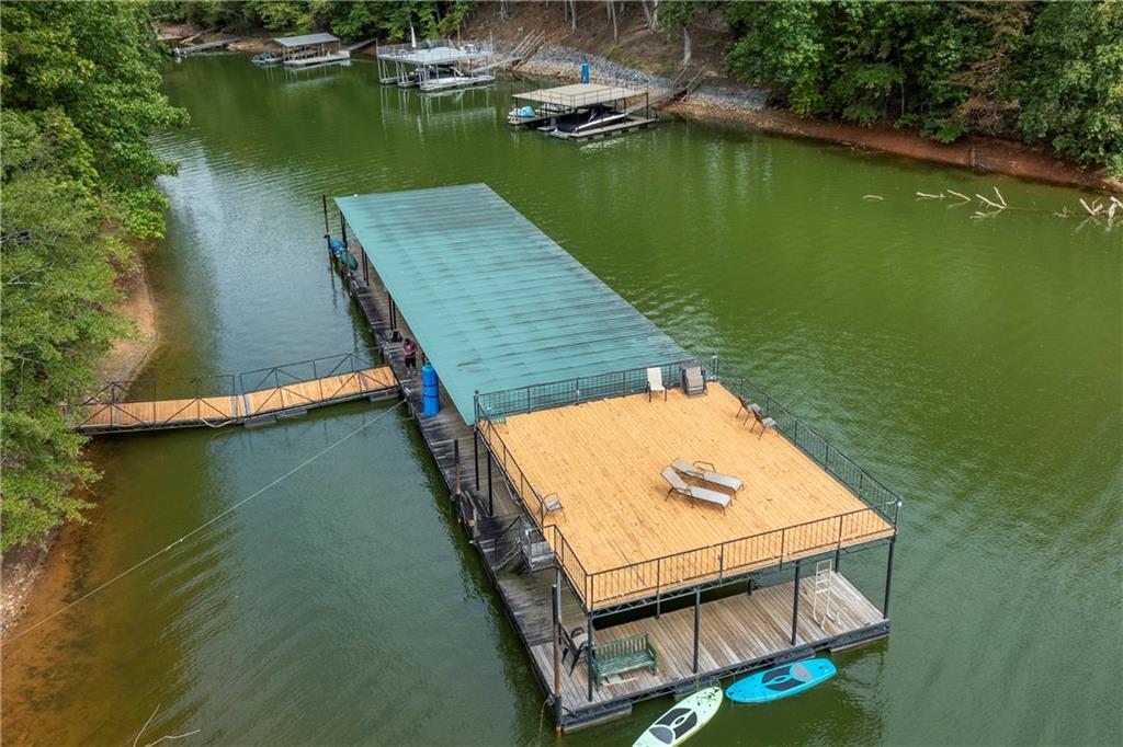 Come experience life at Lake Lanier! While this beautiful home is not lakefront, it offers the ultimate bonus—direct lake access with your own boat slip and shared party deck. This two-story Craftsman-style home welcomes you with a grand two-story foyer, flanked by a formal dining room on one side and a versatile office or bedroom on the other. The soaring family room features floor-to-ceiling windows, a striking stone fireplace, and custom built-in bookcases, flowing seamlessly into the breakfast area and spacious kitchen with granite countertops, a center island, and bar seating. Plus the roof is within 5 years old! The main-level primary suite is oversized and boasts a spa-like ensuite bath for your retreat. Upstairs, you’ll find three additional bedrooms—two connected by a Jack-and-Jill bath—plus another full bath and a large bonus room. The newly finished terrace level offers the perfect in-law suite with a welcoming family room complete with fire place, stunning kitchen with leathered quartz countertops and an island with seating, bedroom, and flexible office space. With lake access just steps away, the 10-slip community dock and party deck provide the perfect spot to enjoy the water and store your boat. Sprinklers installed for landscaping as well as the pest control system in the walls that is accessed from the exterior. This home combines elegant living with the fun of lake life—ideal for both everyday living and entertaining.